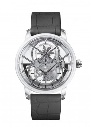 | 机芯 | Jaquet Droz 2625SQ,自动上链镂空陀飞轮机芯,灰色工艺处理,硅质摆轮游丝和擒纵叉,钛金属陀飞轮框架,单发条盒,18K白金摆陀经黑色工艺处理. 摆陀上可进行定制镌刻. |