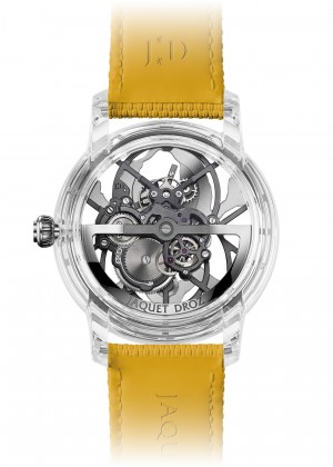 | 机芯 | Jaquet Droz 2625SQ,自动上链镂空陀飞轮机芯,黑色工艺处理,硅游丝和擒纵叉瓦,钛金属陀飞轮框架,单发条盒,18K白金摆陀. 摆陀上可进行定制镌刻. |