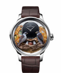 Hand-engraved and hand-painted 18-karat yellow gold and white mother-of-pearl dial, black onyx subdial. 18-karat white gold case and applied ring. Applied decoration in 18-karat yellow gold and birds in hand-engraved and hand-painted 18-karat white gold. Mechanical automaton with animation featuring birds, hatching egg and mirage. Minute repeater, hand-wound mechanical movement. Power reserve of 48 hours. Diameter 47 mm. Unique piece.
