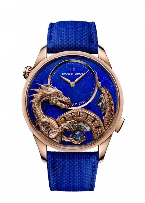 Jaquet Droz 6150, self-winding mechanical movement, silicon balance spring and pallet horns, flat bridges, 18-karat red gold oscillating weight with JH signature and black treatment. Automaton with animation of different parts of the dragon, push-button automaton triggering mechanism. |