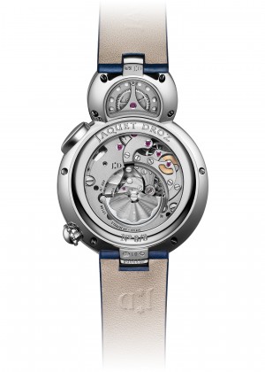 Movement Mechanical opening flower automaton movement. 18-karat white gold petals. Rotation of a briolette blue sapphire (0.24 carat) in both directions. Direct manual automaton triggering via a push-button at 2 o'clock. Length of animation: 6 to 8 seconds. Jaquet Droz 615, self-winding mechanical movement, silicon balance spring and pallet horns, platinum oscillating weight.
