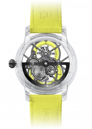 | Dial | Transparent sapphire dial and yellow sapphire base. 18-karat white gold indexes with black treatment, 18-karat white gold dial fixing axes. |