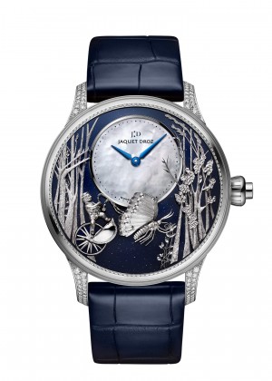 アベンチュリン ダイアル. 手作業による彫刻を施した18Kホワイトゴールドの彫金細工. 212個のダイヤモンド(合計0.68カラット)を施した. 18Kホワイトゴールドケース. オートマタ用の手巻きムーブメント、 プッシュボタンで蝶の羽と車輪を動かすオートマタの作動システム. 時分表示用自動巻きムーブメント. 68時間パワーリザーブ. 直径43mm. 世界限定28本.