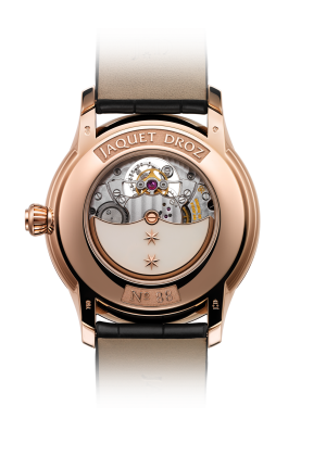 | ムーブメント | Jaquet Droz 25JD、トゥールビヨン機構付自動巻機械式ムーブメント、シングルバレル、18Kレッドゴールドローター、ホワイトオニキスの植字 |