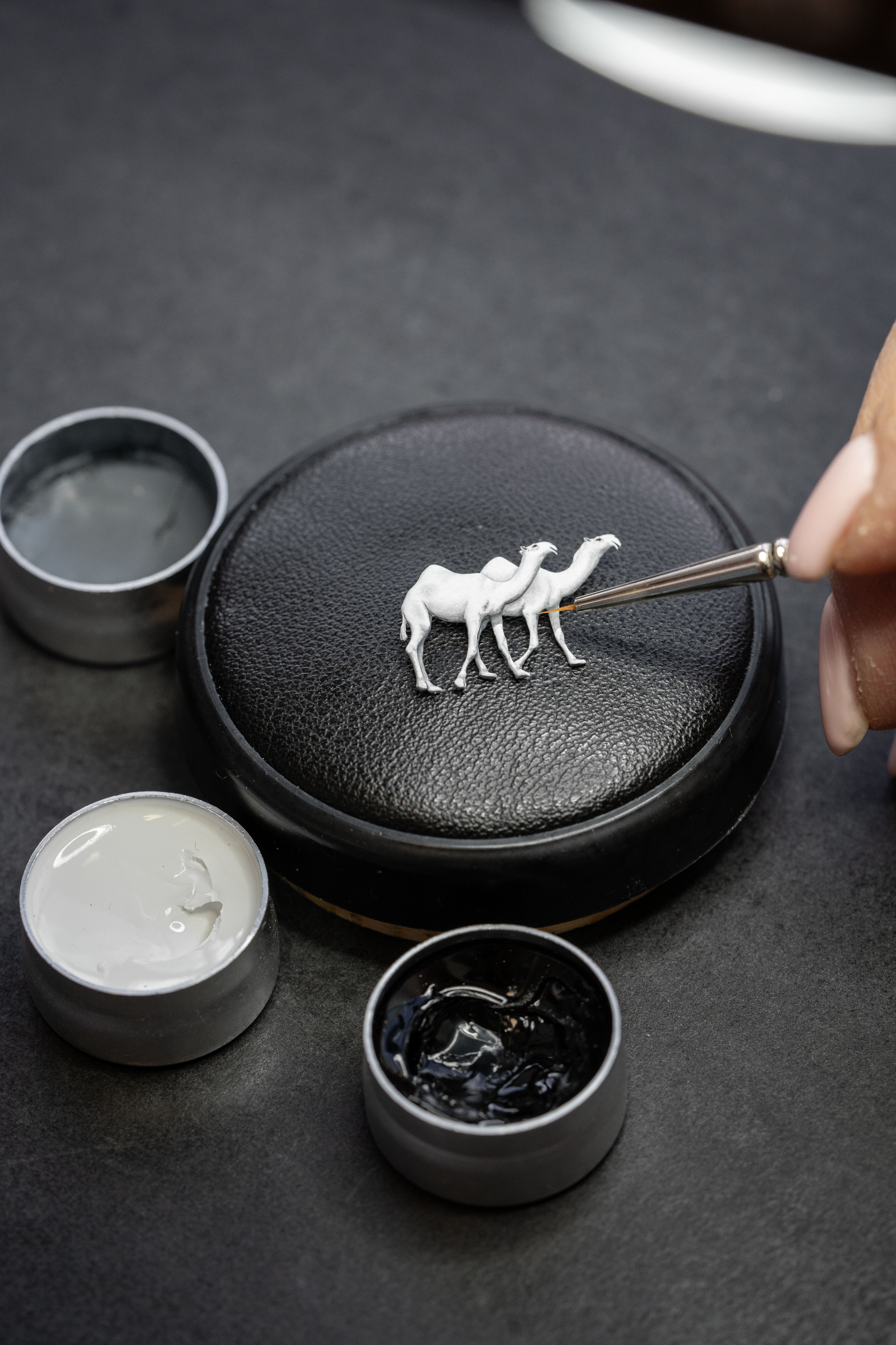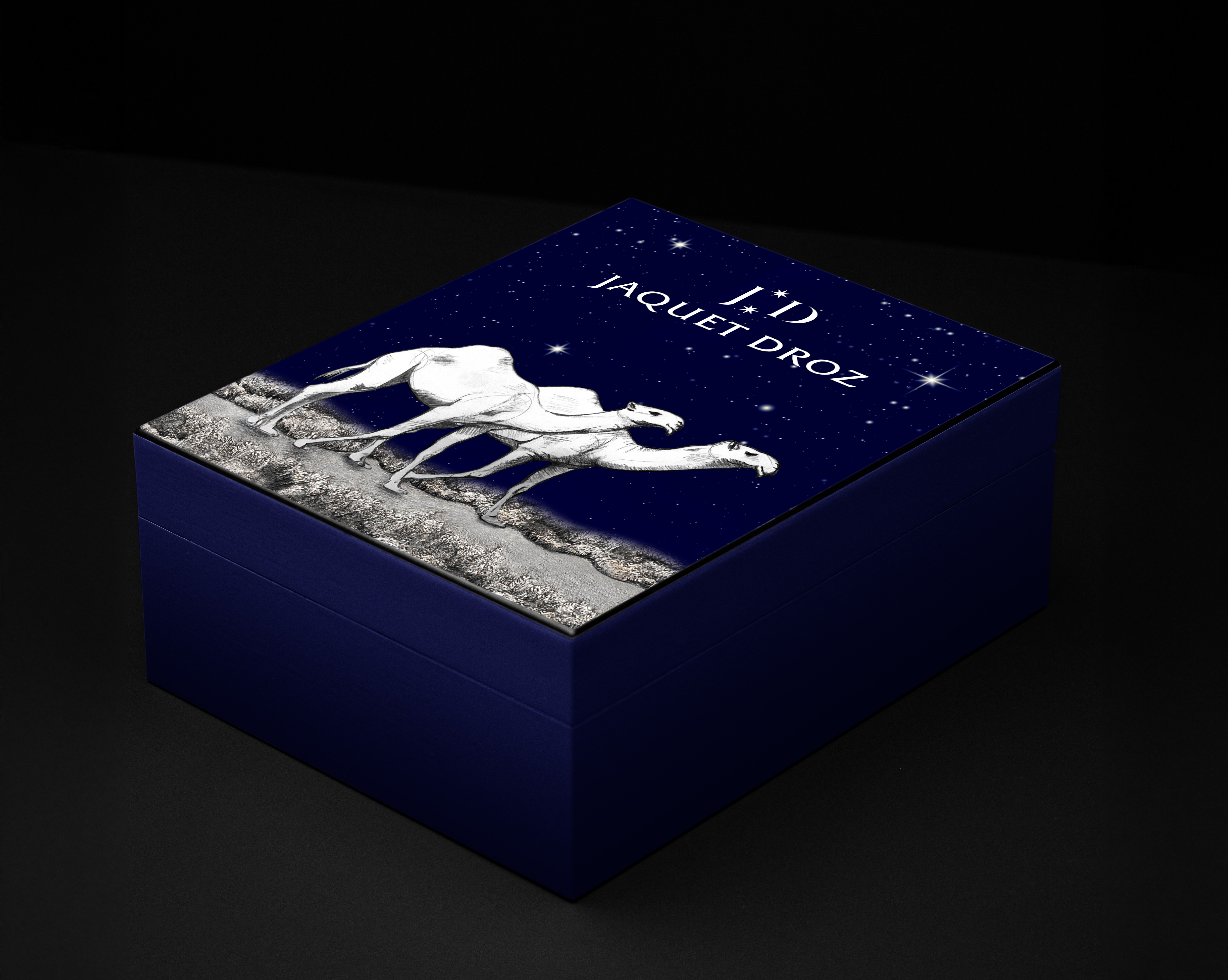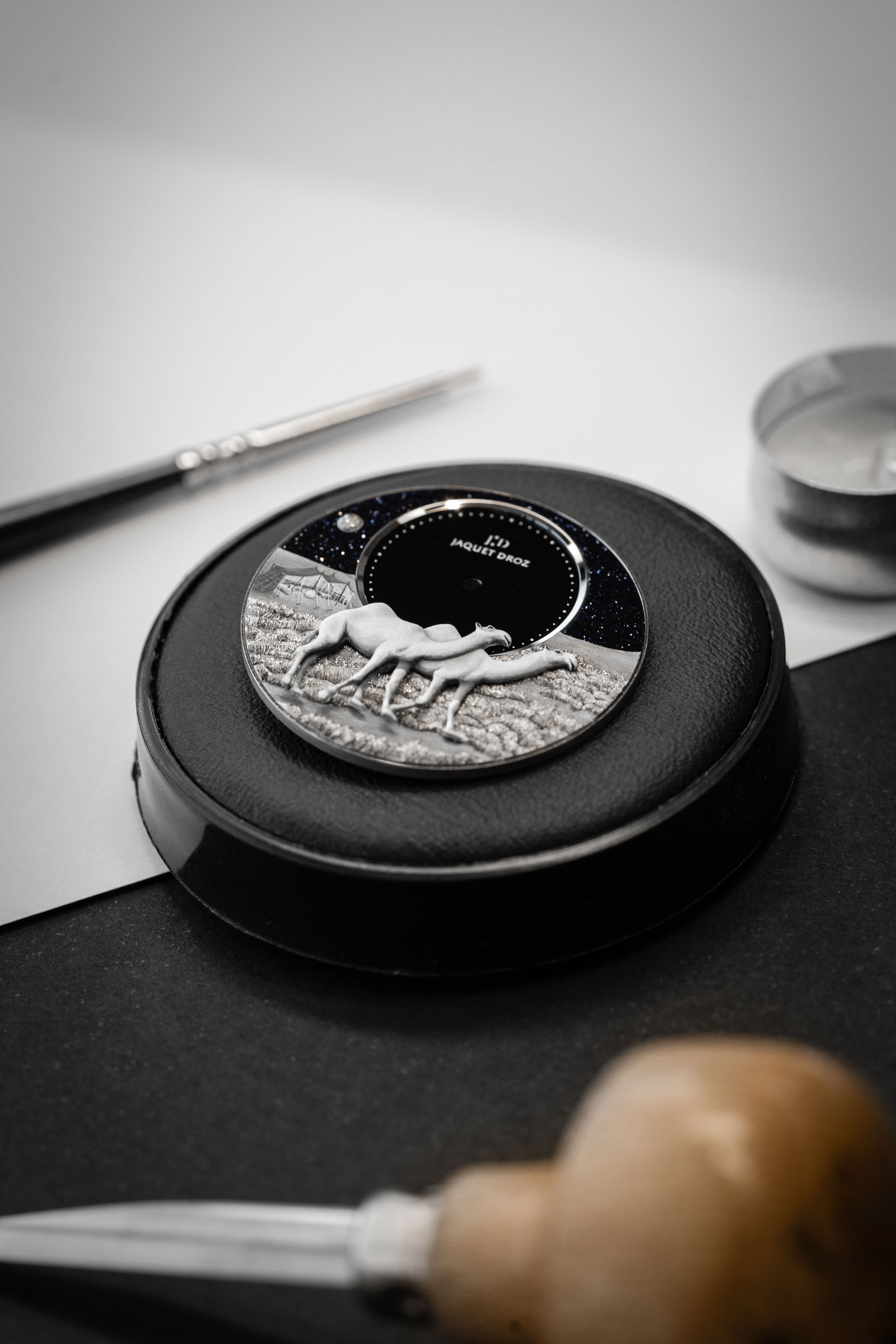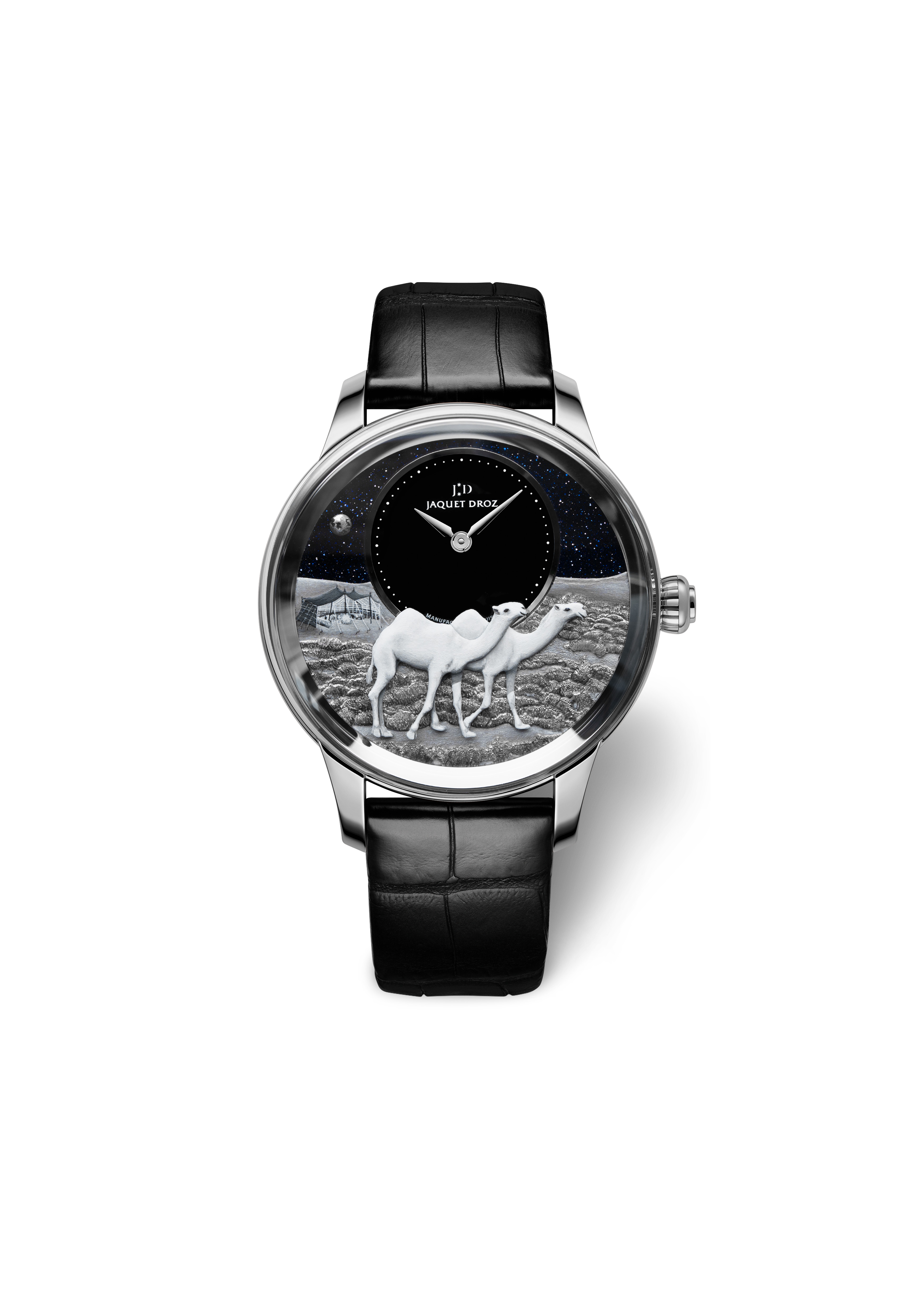 Based on the vision of one of its collectors, an aficionado of the most beautiful dromedaries, Jaquet Droz has created a unique piece for him, in a bespoke platinum case. Engraving and painting compete with precision on a mineral base of onyx and aventurine.