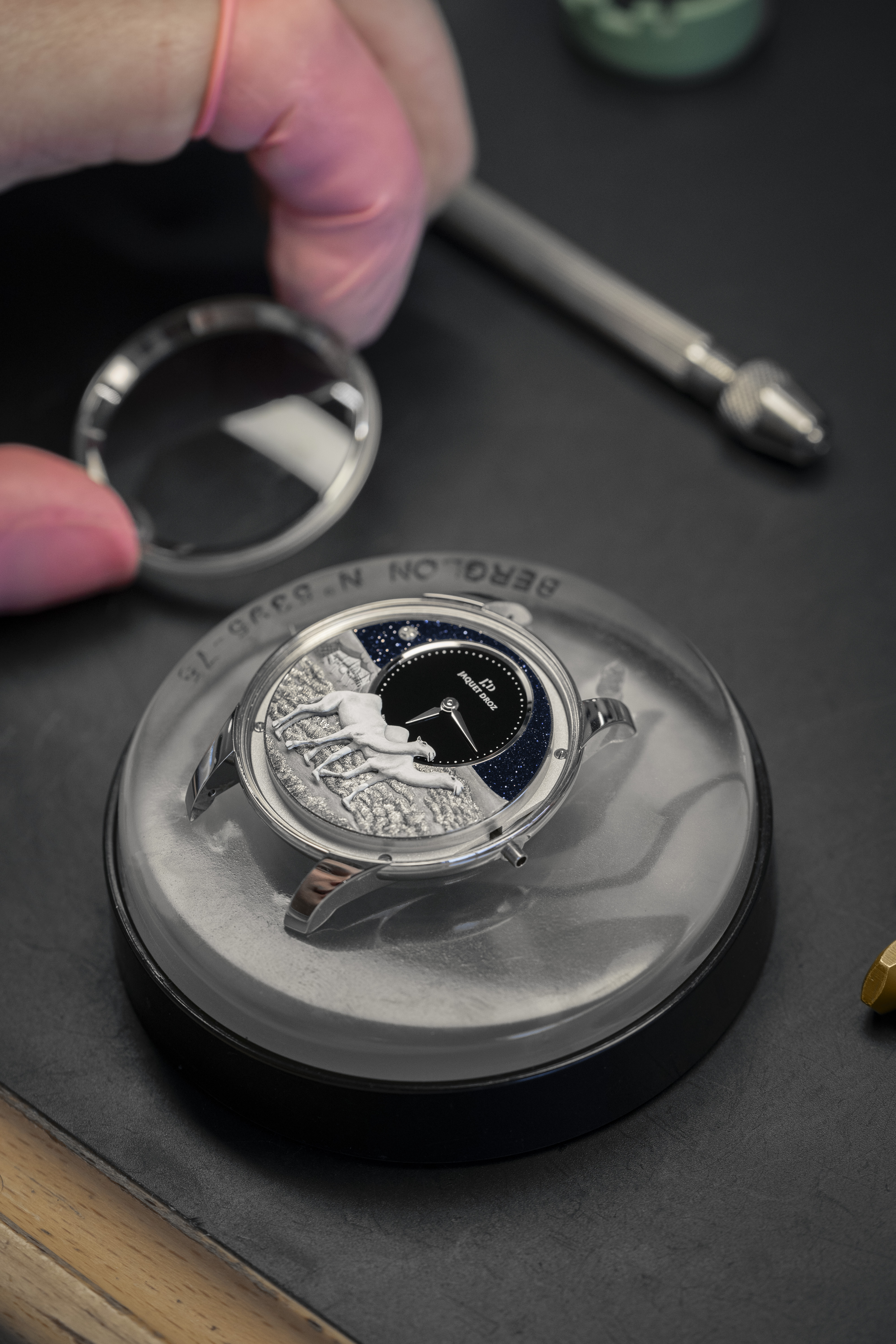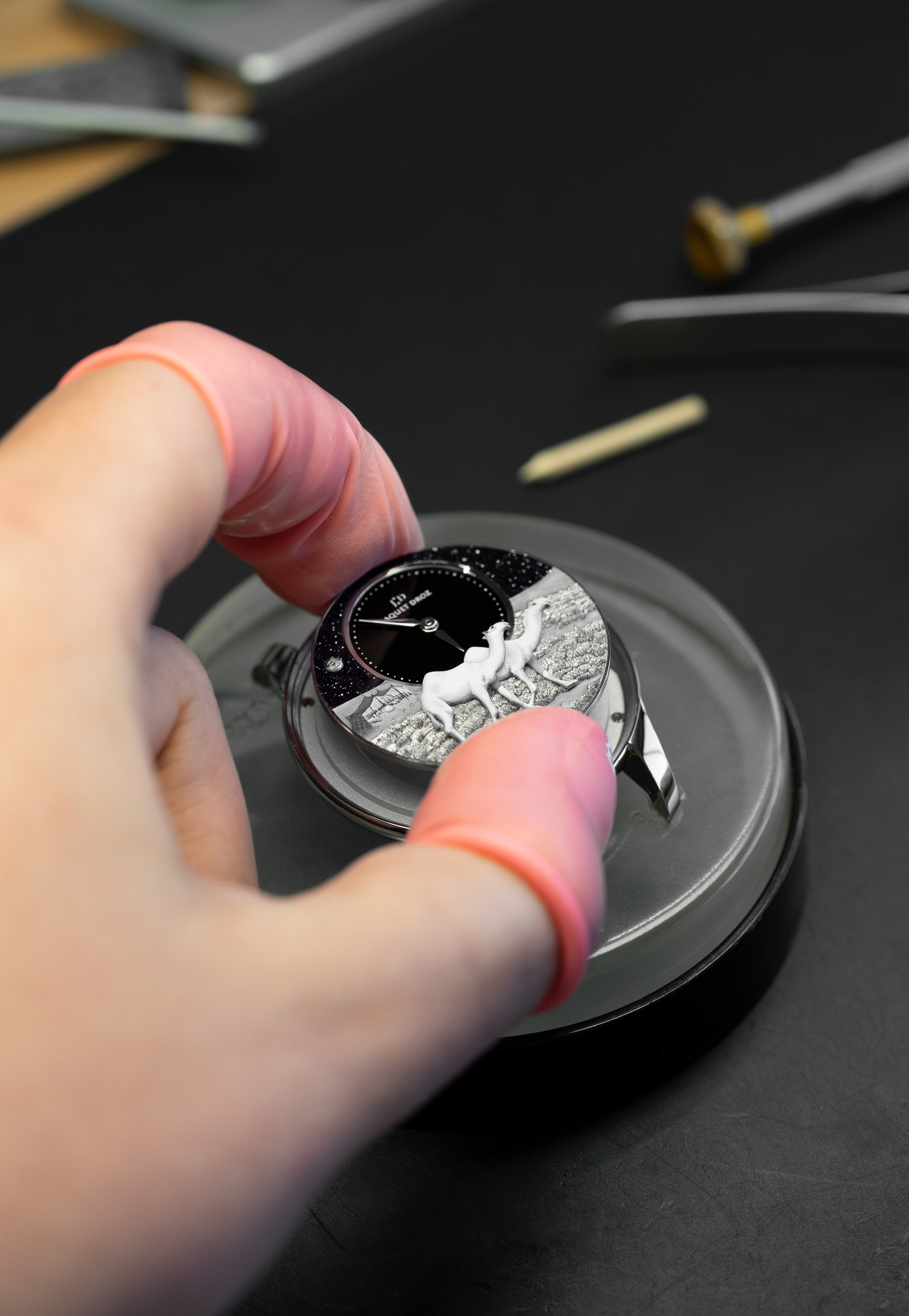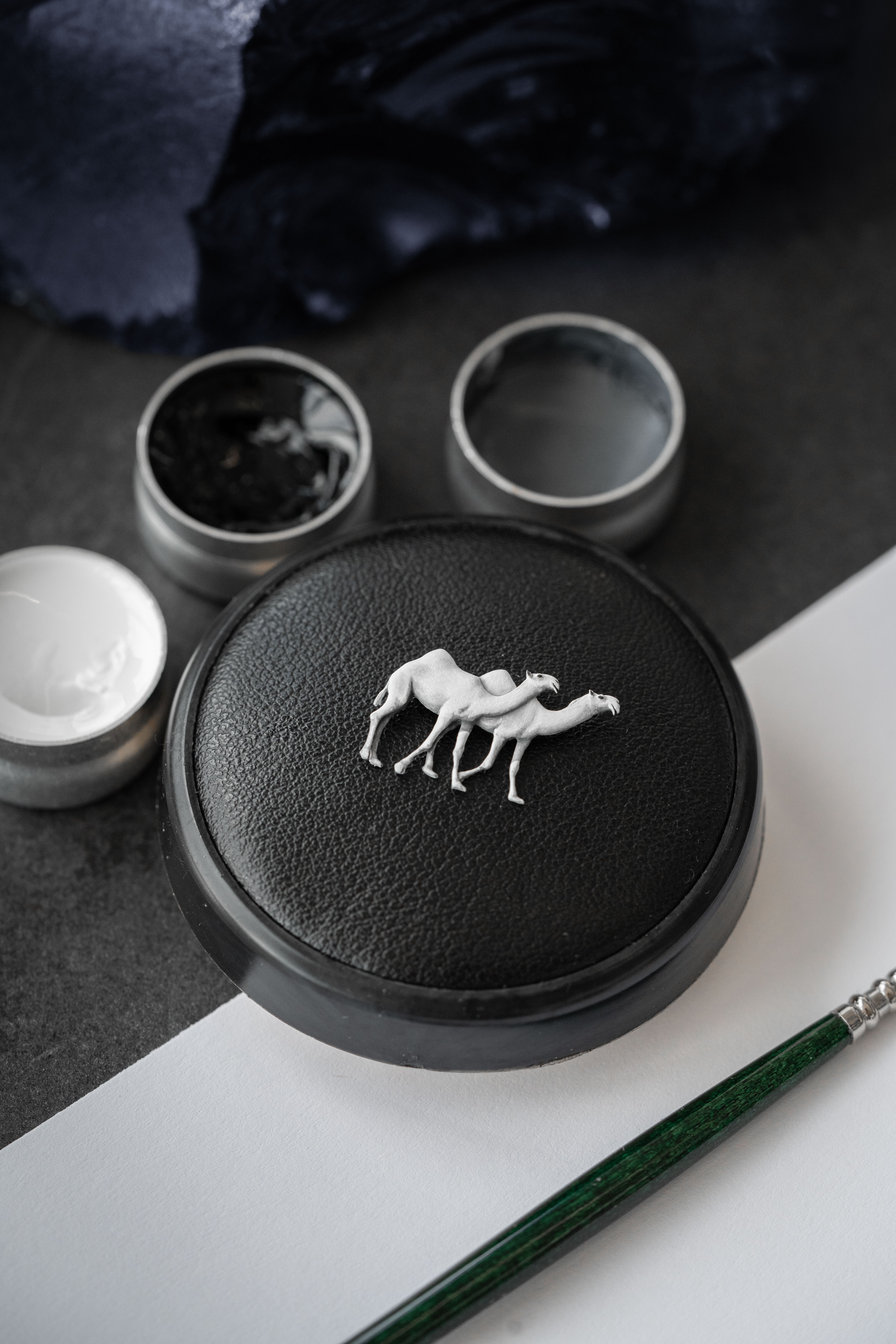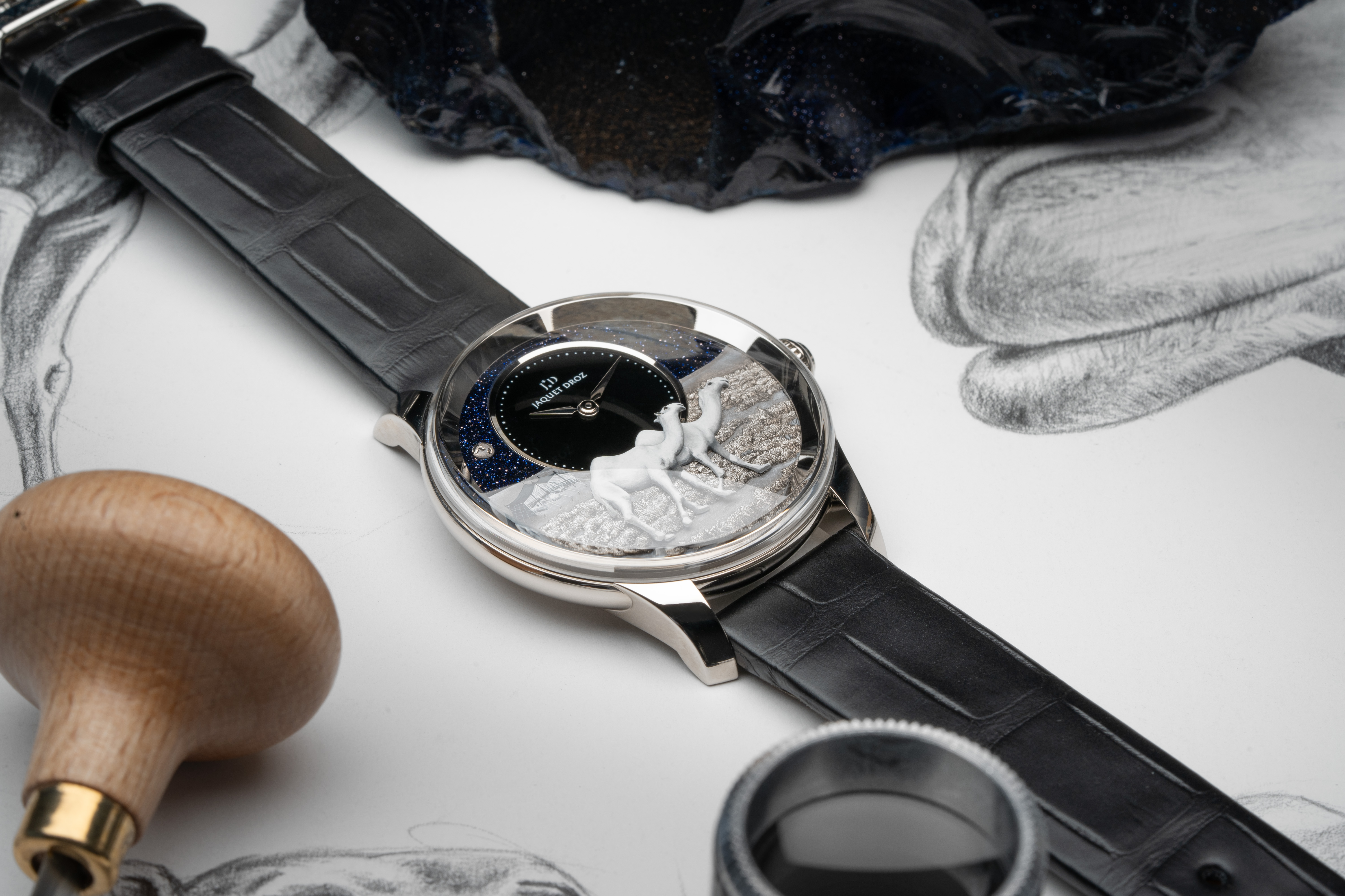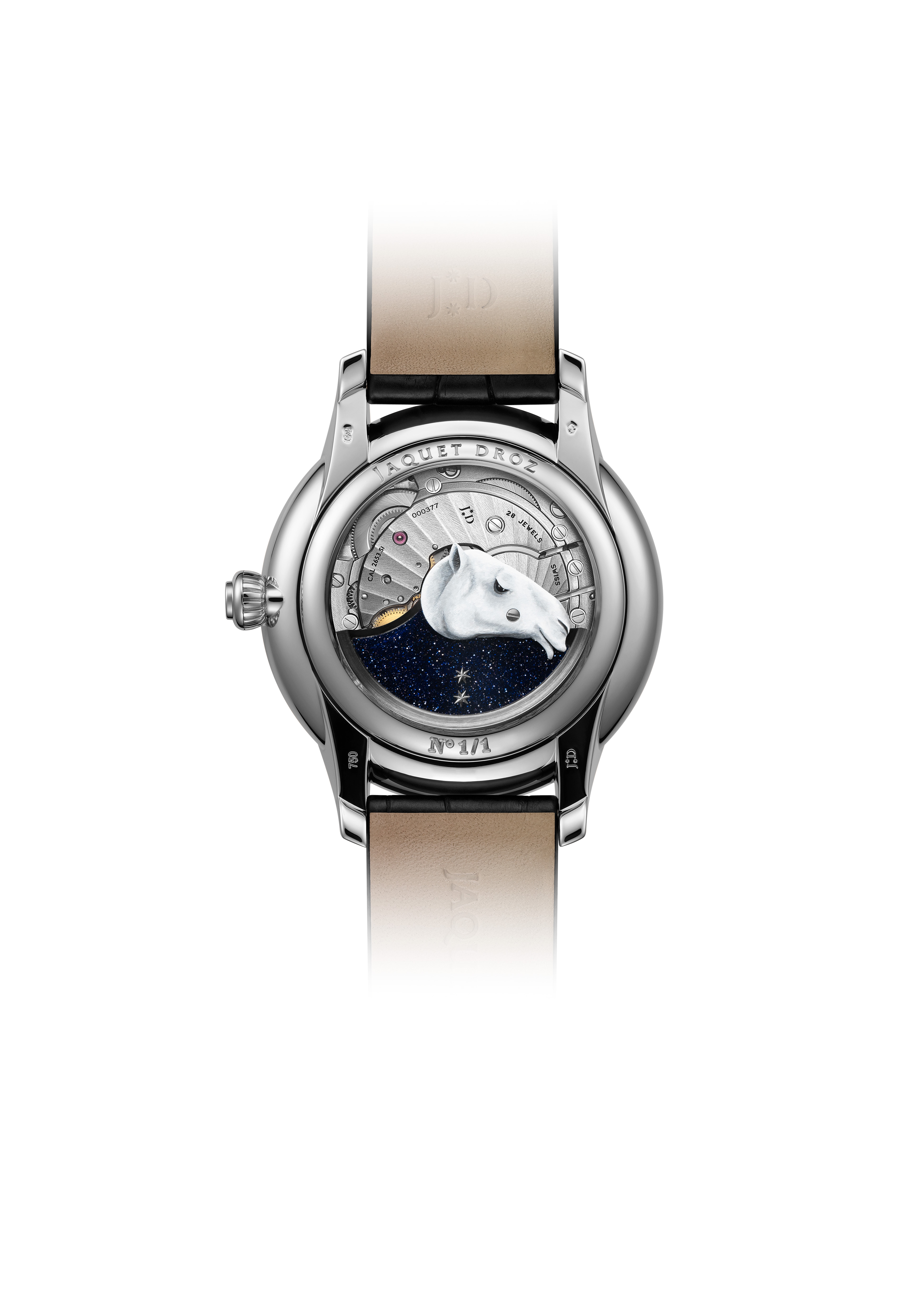 Based on the vision of one of its collectors, an aficionado of the most beautiful dromedaries, Jaquet Droz has created a unique piece for him, in a bespoke platinum case. Engraving and painting compete with precision on a mineral base of onyx and aventurine.