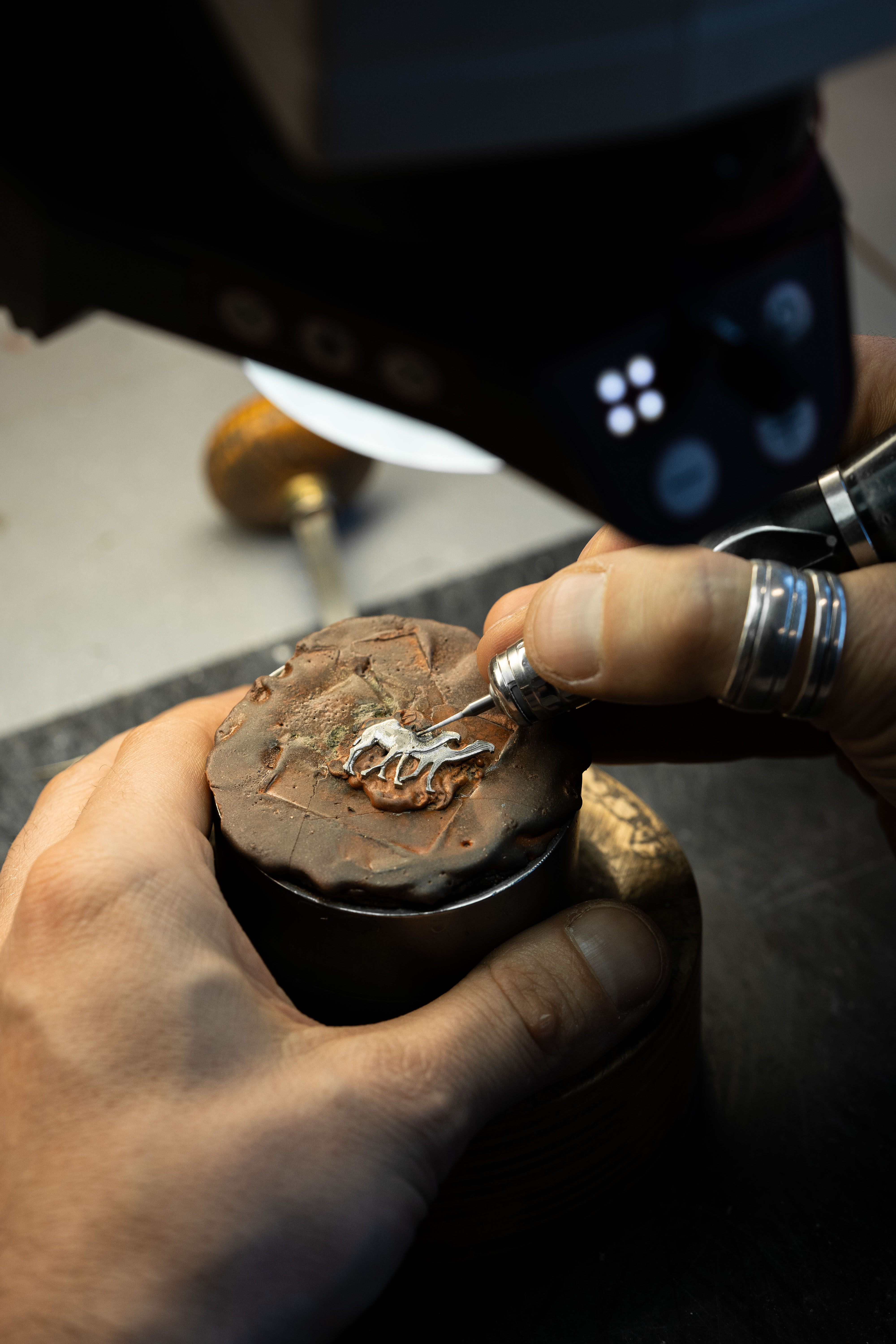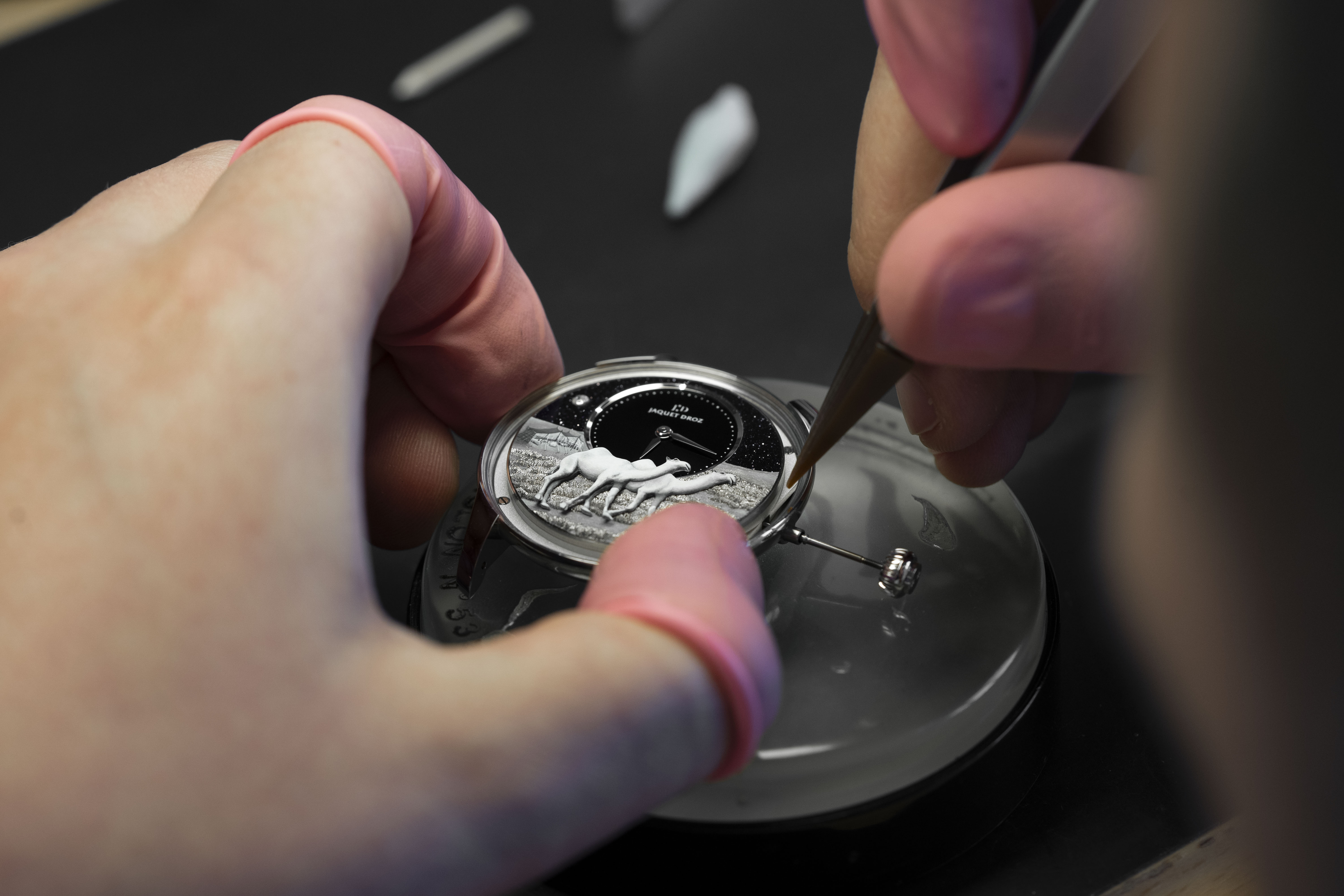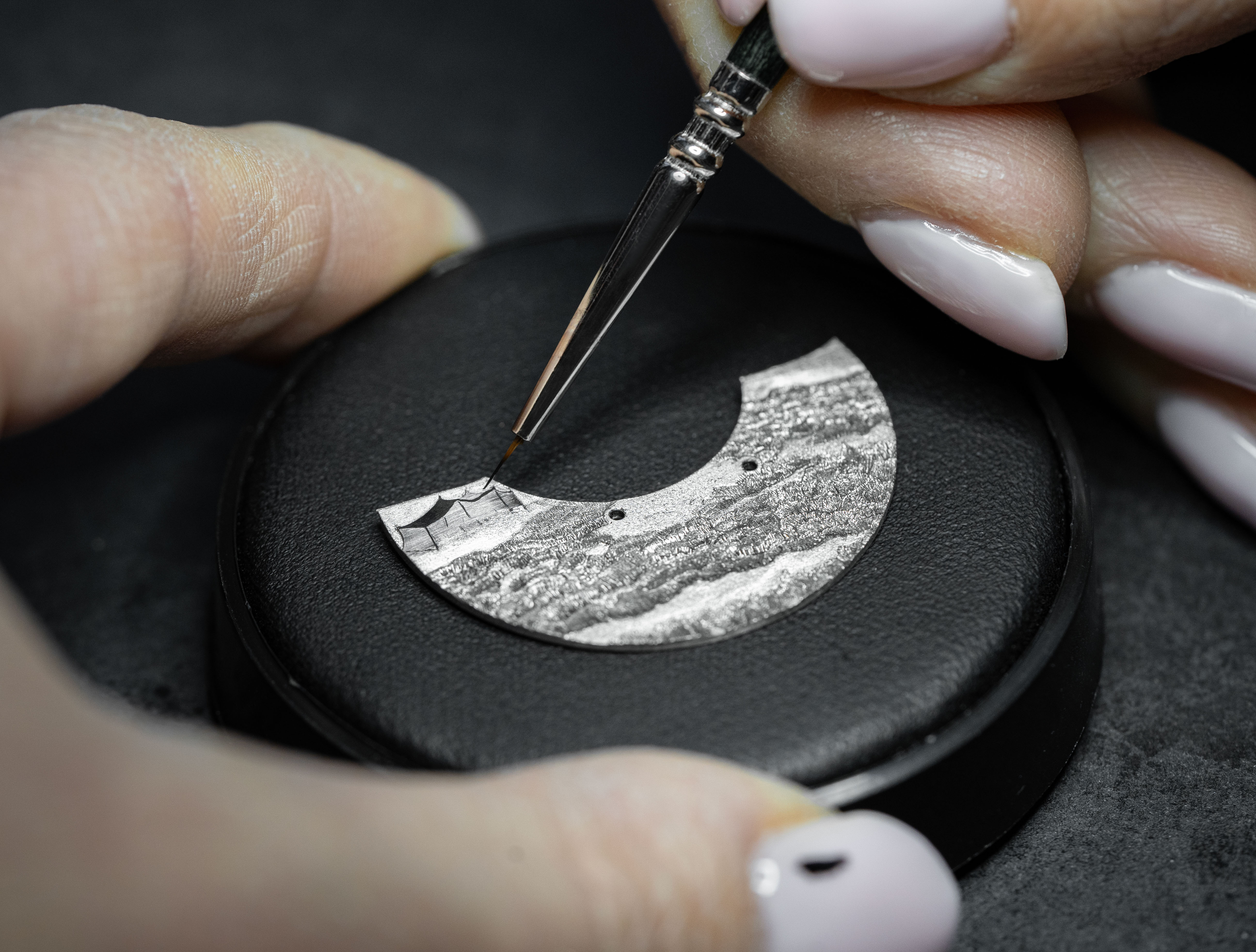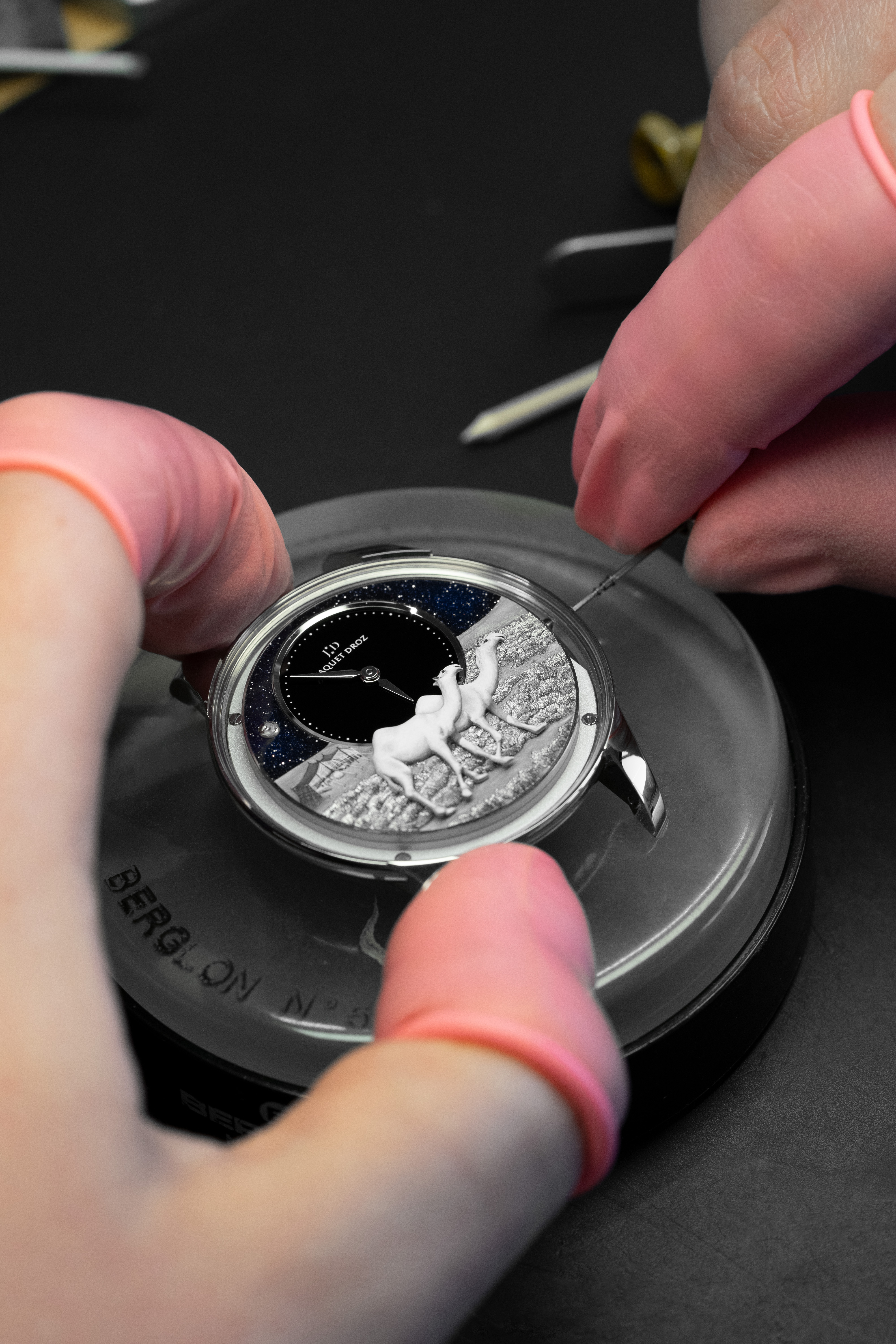 Based on the vision of one of its collectors, an aficionado of the most beautiful dromedaries, Jaquet Droz has created a unique piece for him, in a bespoke platinum case. Engraving and painting compete with precision on a mineral base of onyx and aventurine.