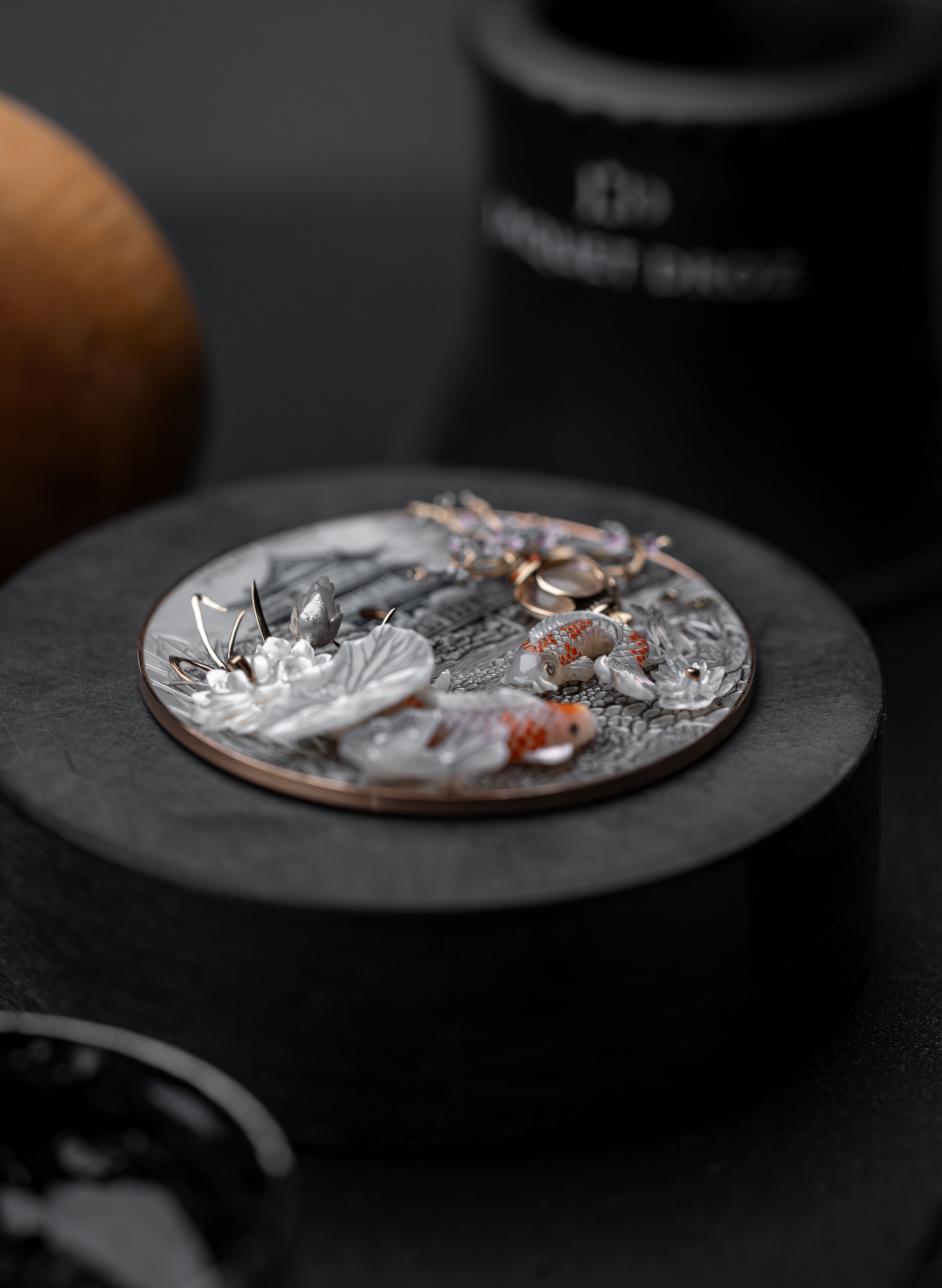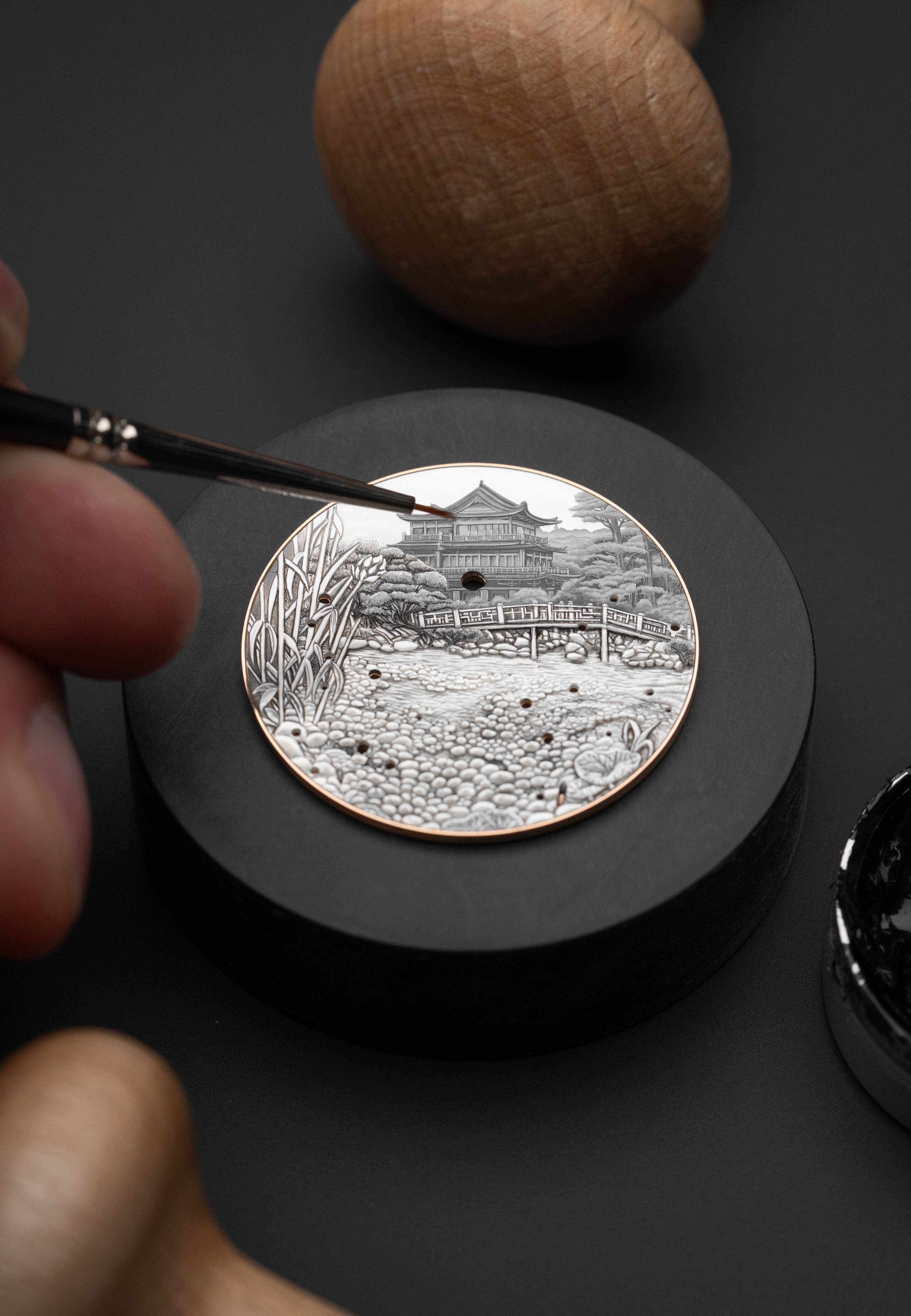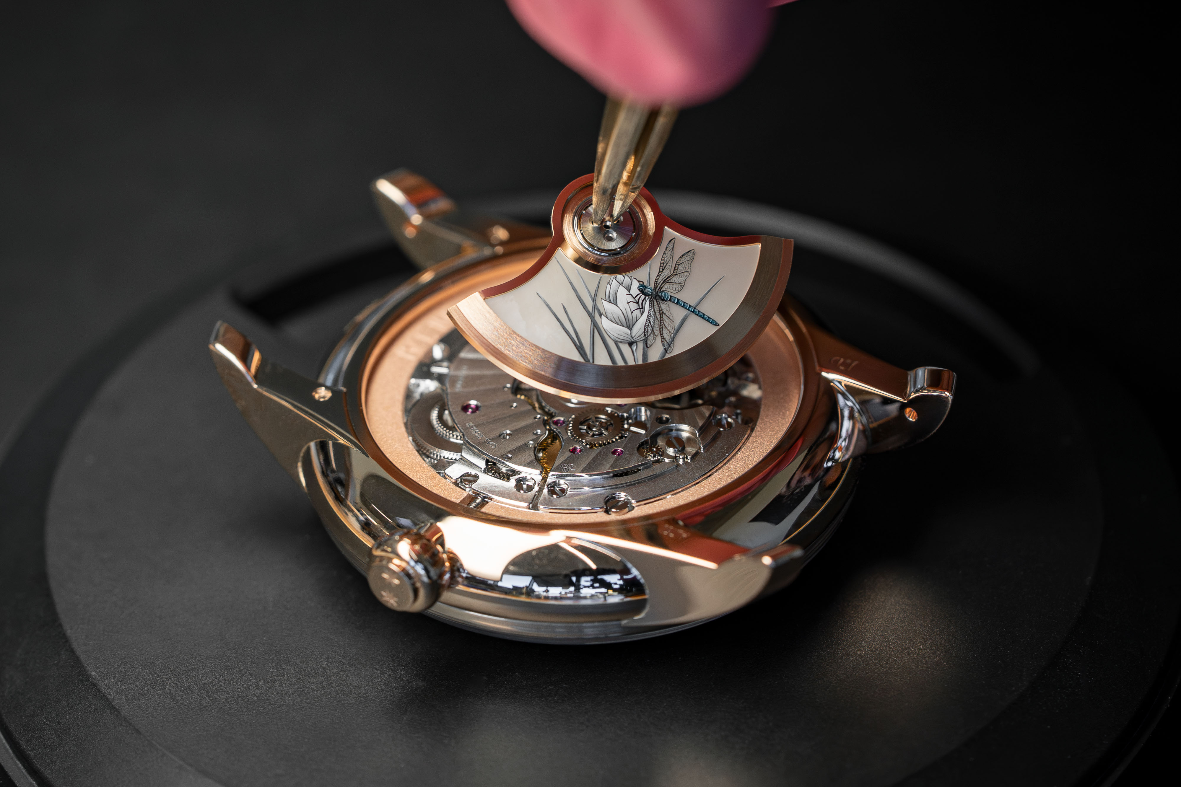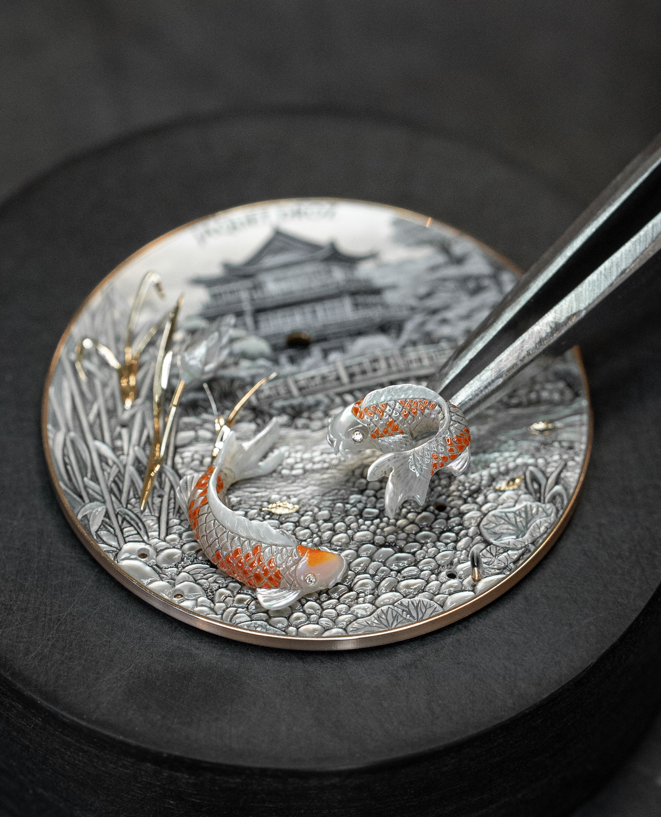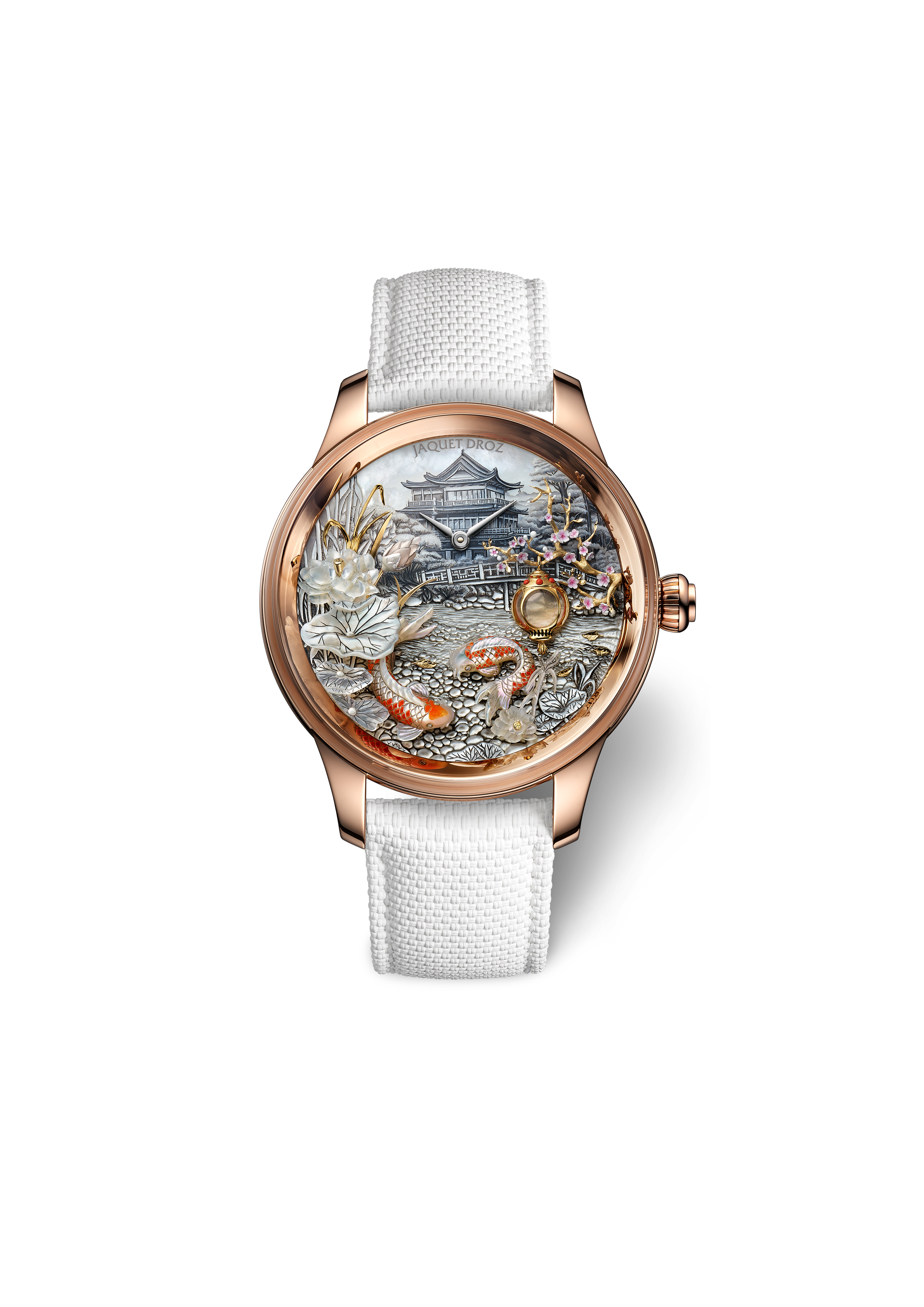 A unique piece created for and alongside a collector, the Petite Heure Minute Red Gold - Japanese Garden takes the art of mother-of-pearl engraving and carving to a whole new level. The dial and more than 20 appliques are crafted from this material, recreating the serenity of a living, three-dimensional space.