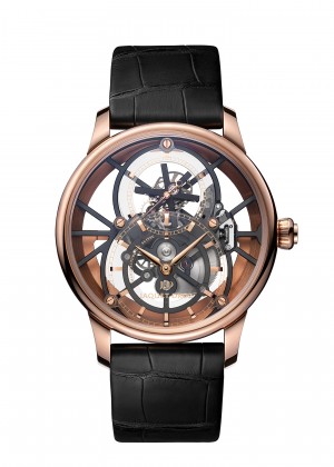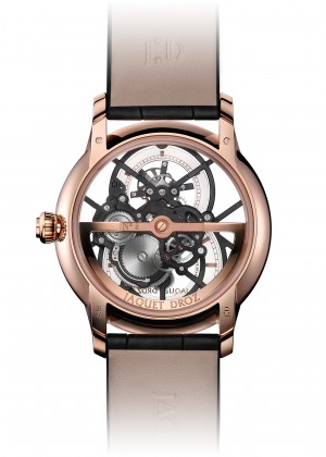 | Калибр | Jaquet Droz 2625SQ, оснащенный турбийоном, скелетонированный механизм с автоматическим подзаводом, с черным покрытием, спираль и рожки анкерной вилки из кремния, каретка турбийона из титана, одинарный барабан, инерционный груз из розового золота 750 пробы. Выгравированный на инерционном грузе индивидуальный номер серии. |