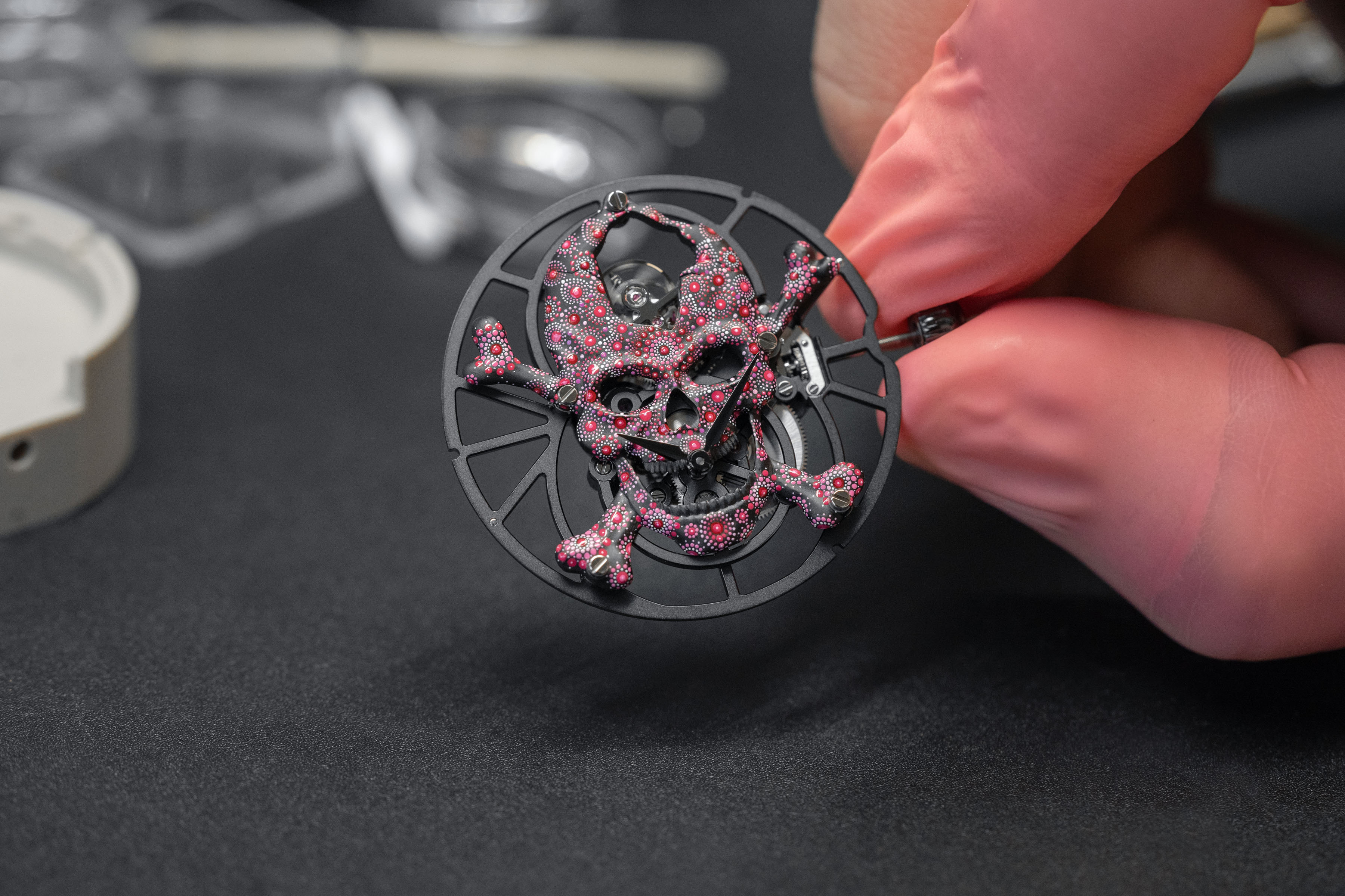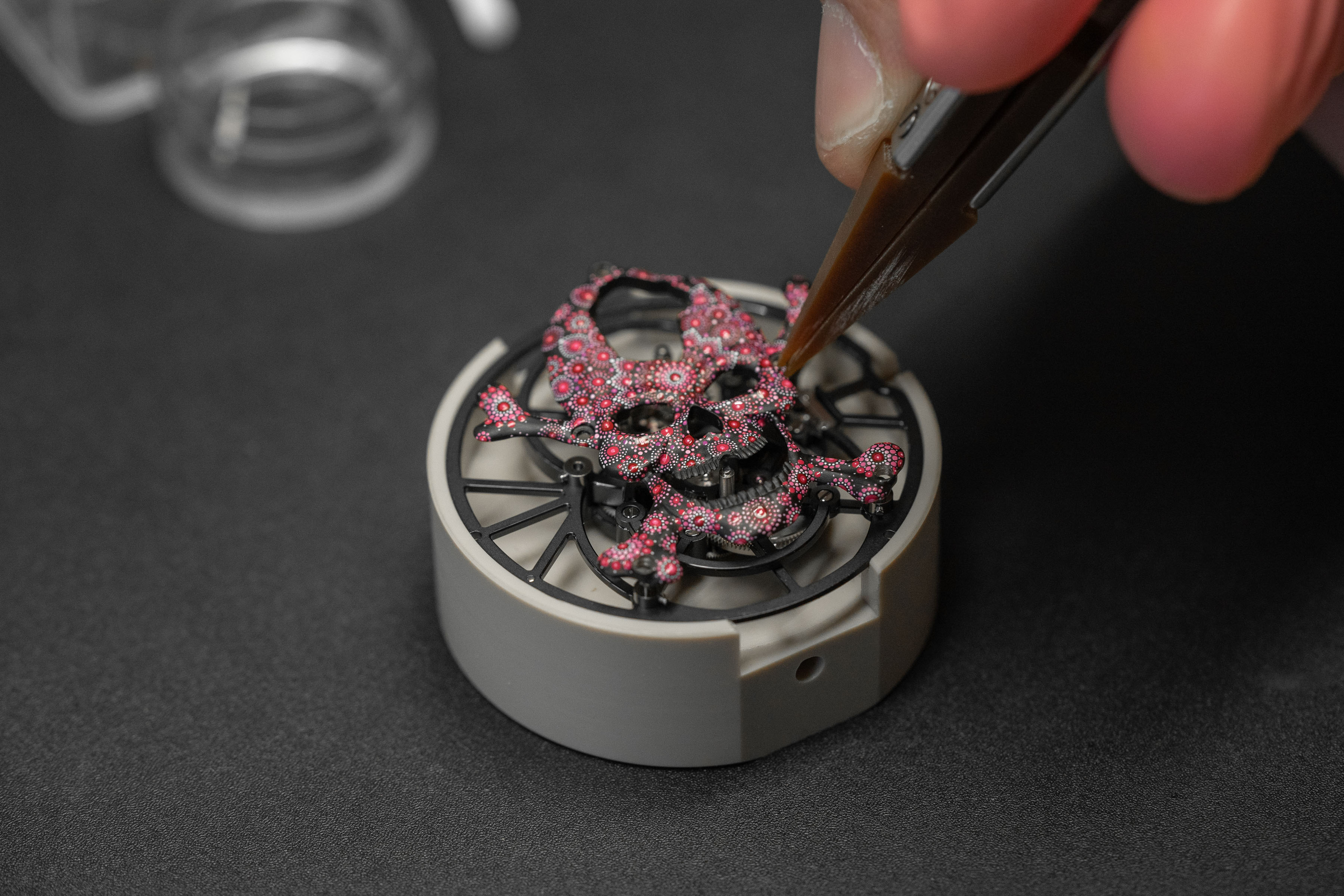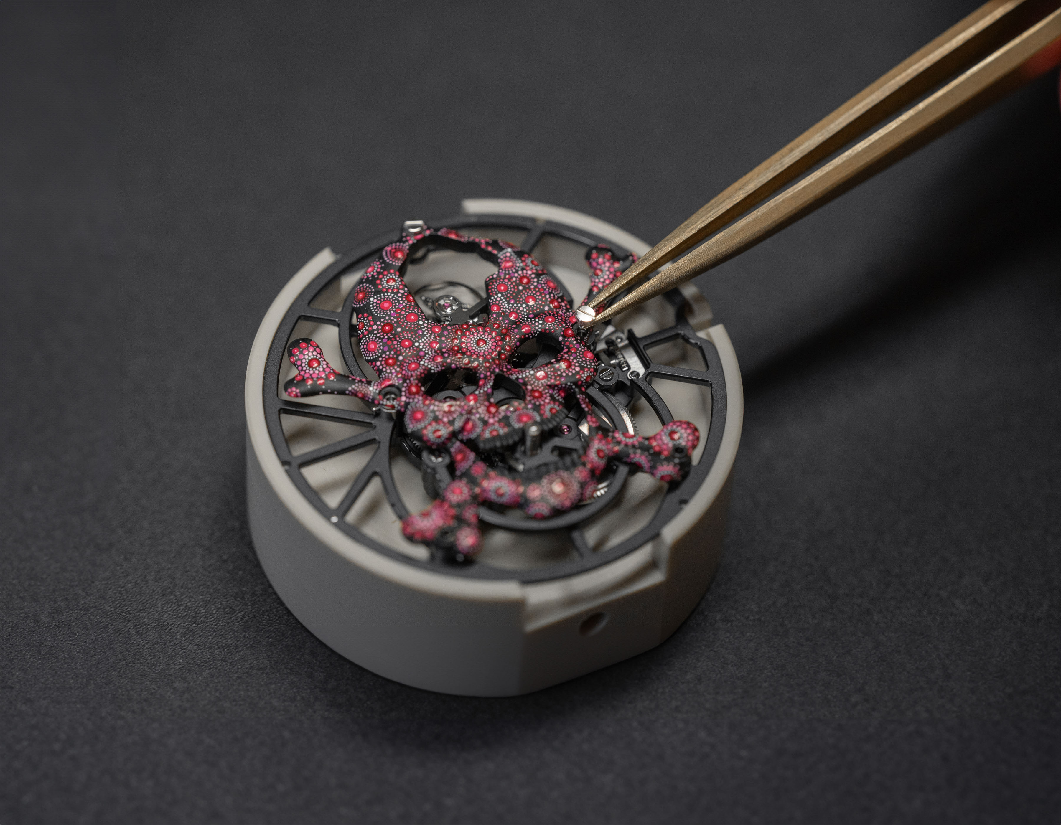 The Tourbillon Skelet Ceramic - Skull Pink Pointillism is unique, and always will be. A work of art in its own right, born from the creative mind of an aesthete and collector, it combines the Carpe Diem with a pointillist motif painted entirely by hand in a bold, vivid pink.