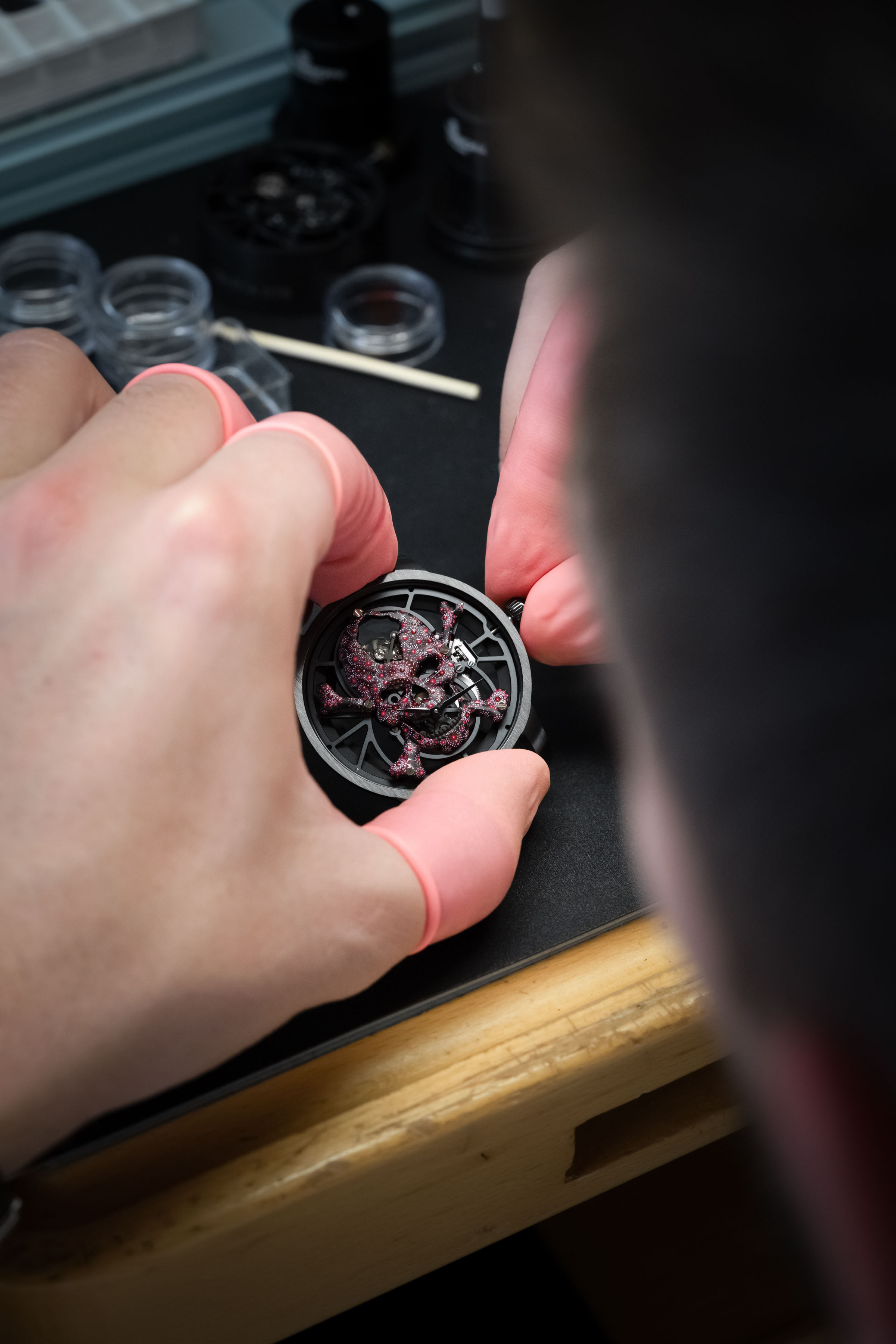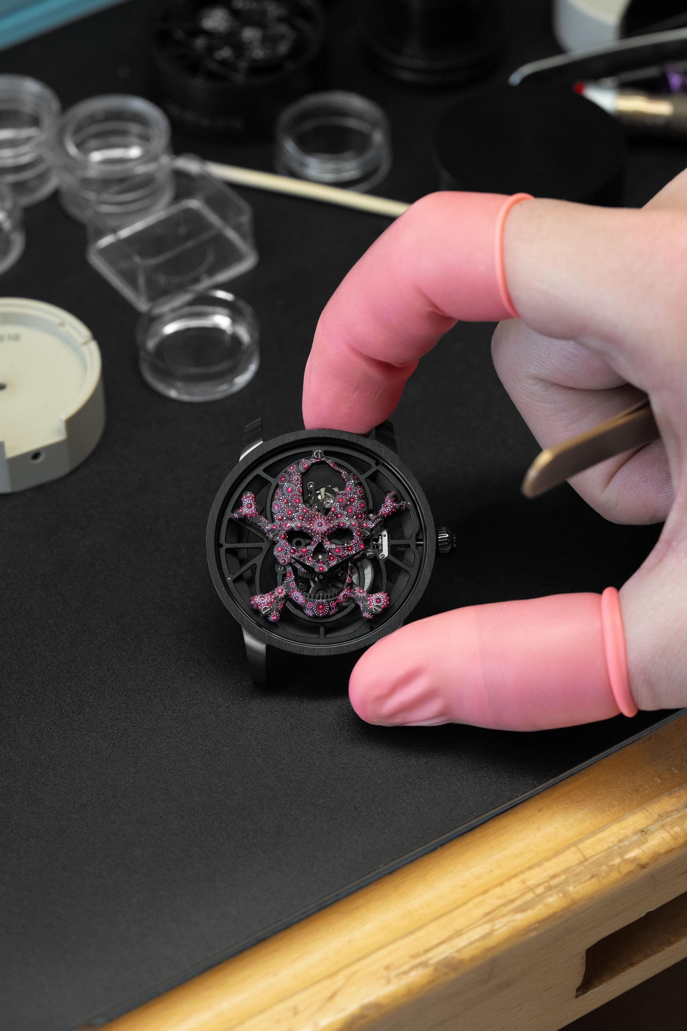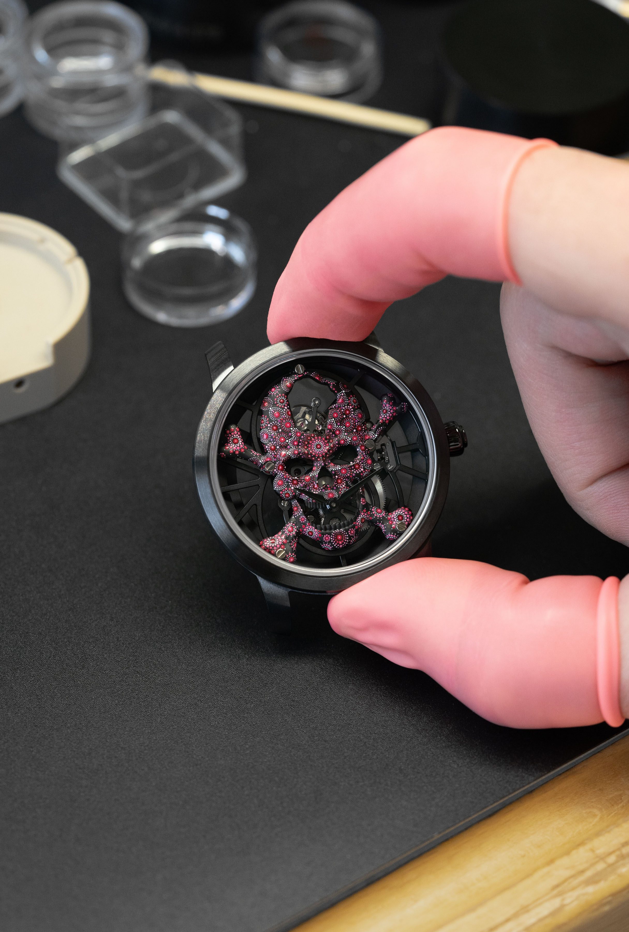 The Tourbillon Skelet Ceramic - Skull Pink Pointillism is unique, and always will be. A work of art in its own right, born from the creative mind of an aesthete and collector, it combines the Carpe Diem with a pointillist motif painted entirely by hand in a bold, vivid pink.