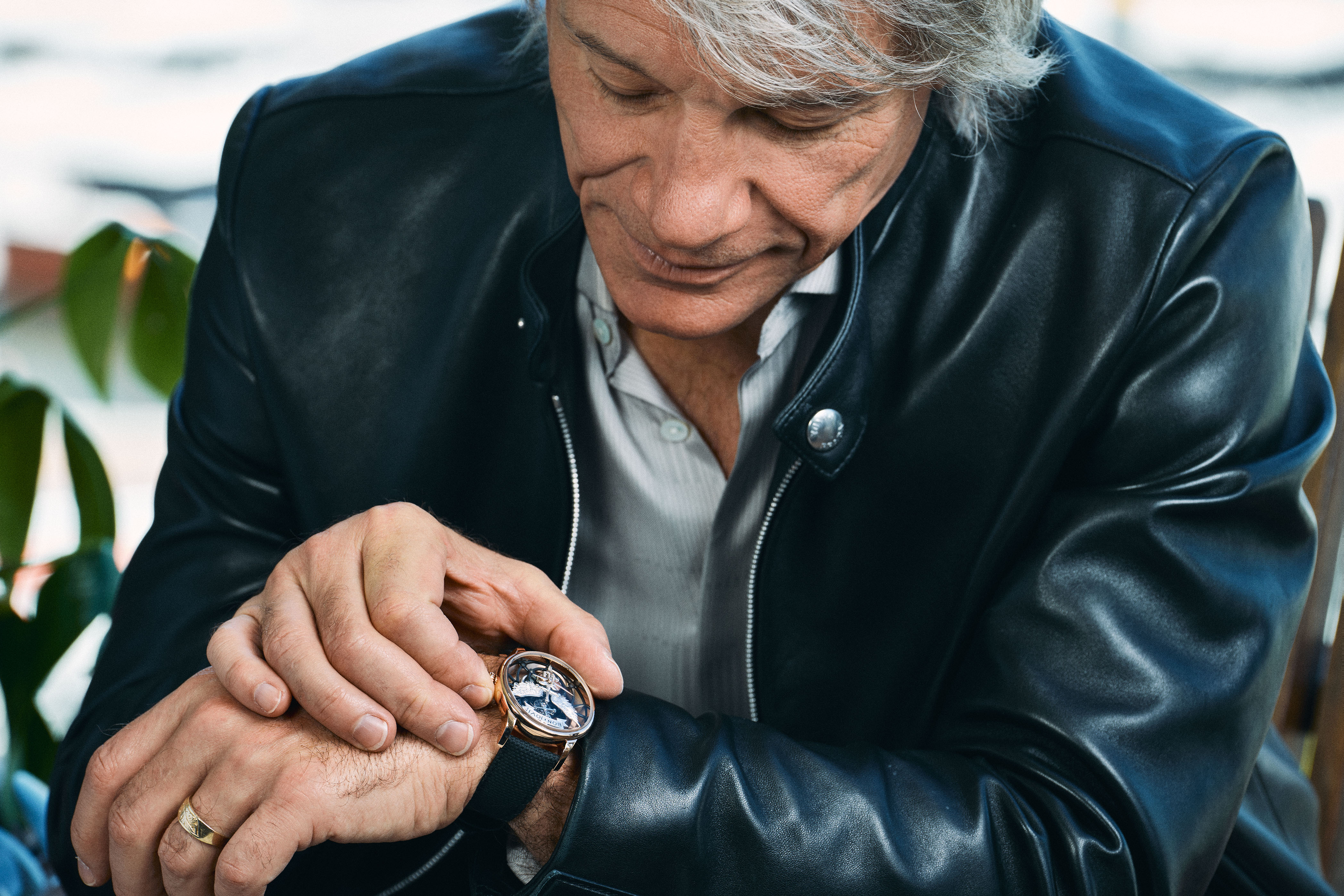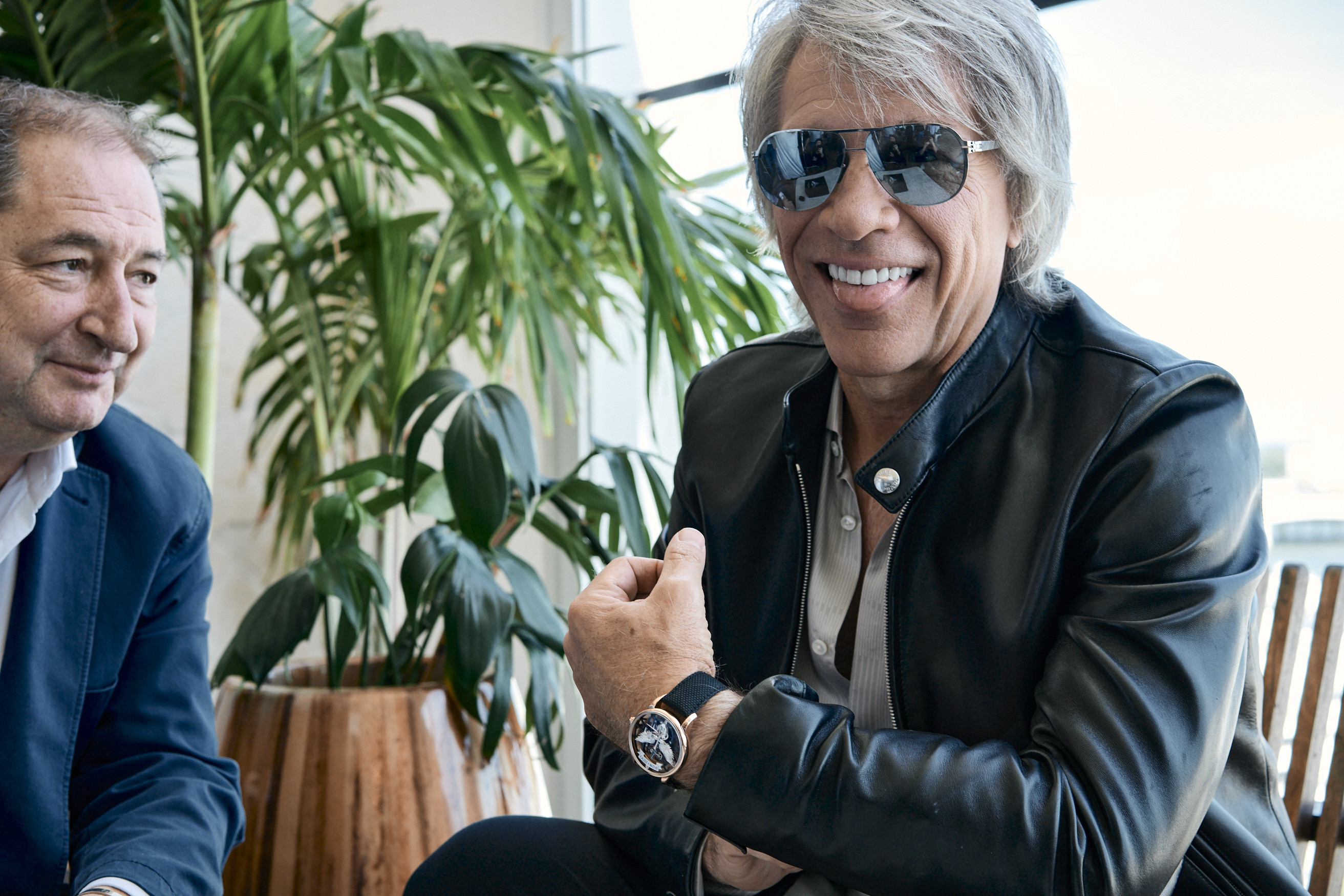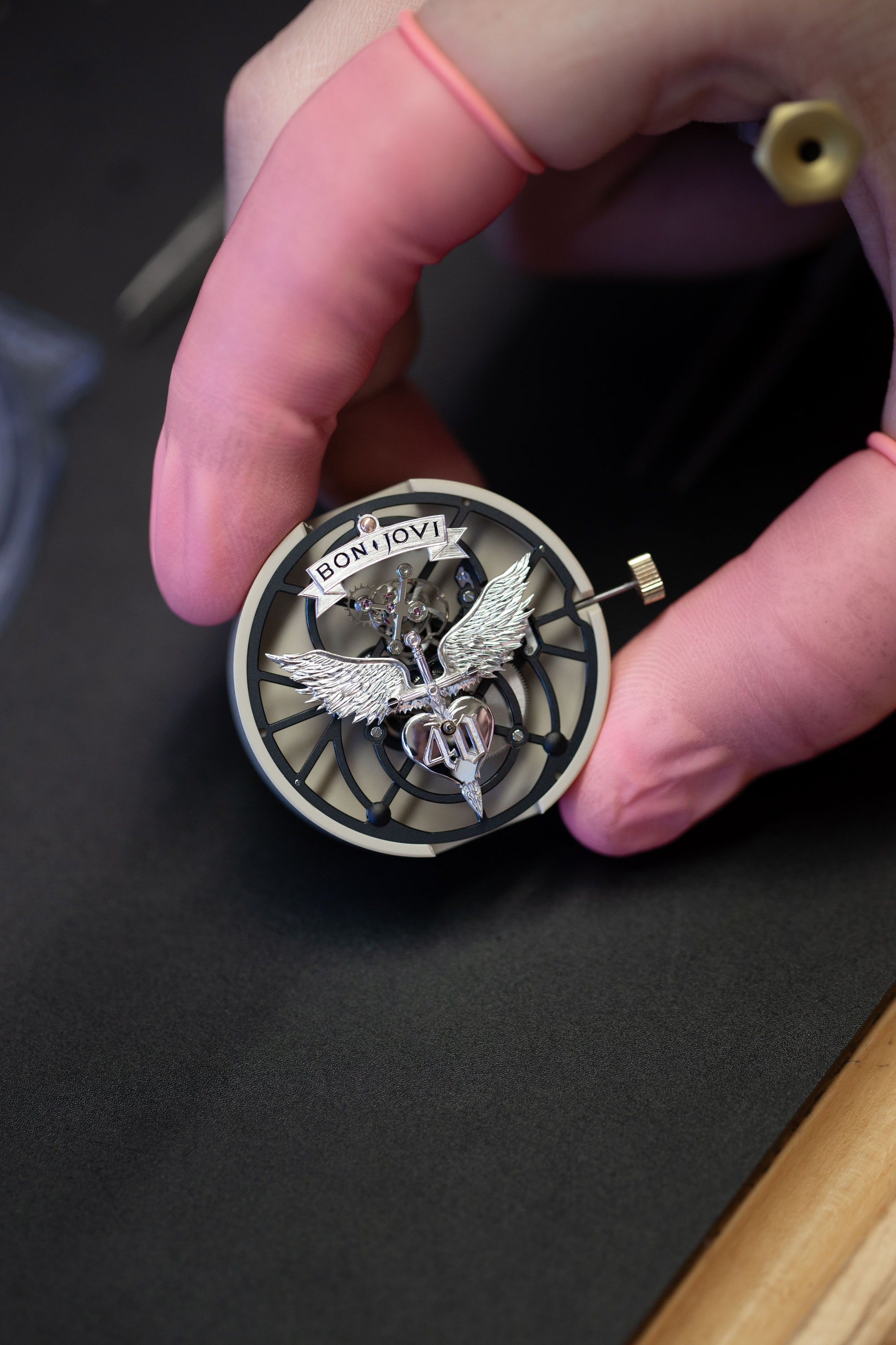 The Tourbillon Skelet Red Gold - Bon Jovi is a unique piece handcrafted to the artist's personal specifications. A self-winding skeleton tourbillon with an 8-day power reserve, it features the brand's new 40th anniversary logo, hand-engraved from a solid gold block.