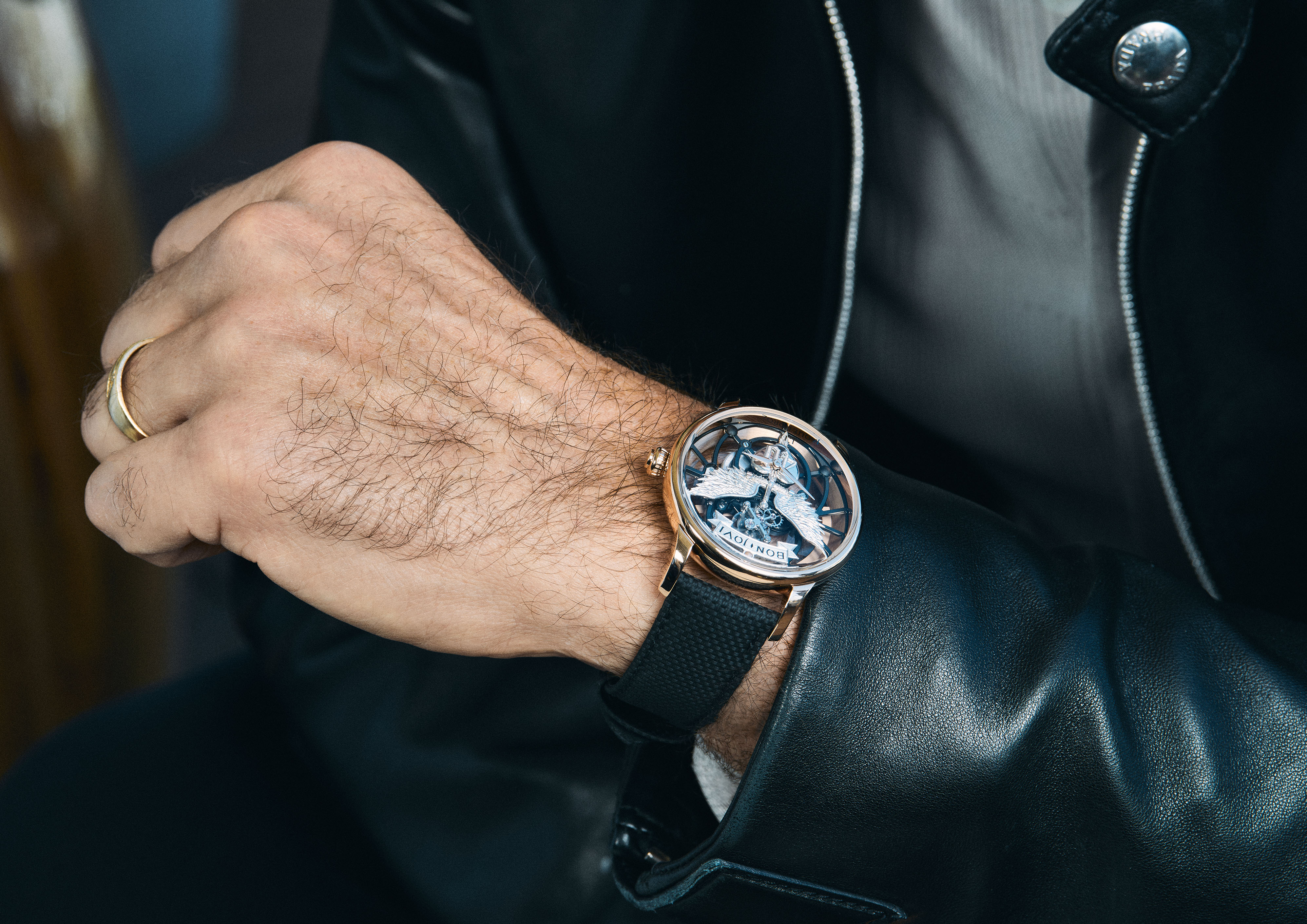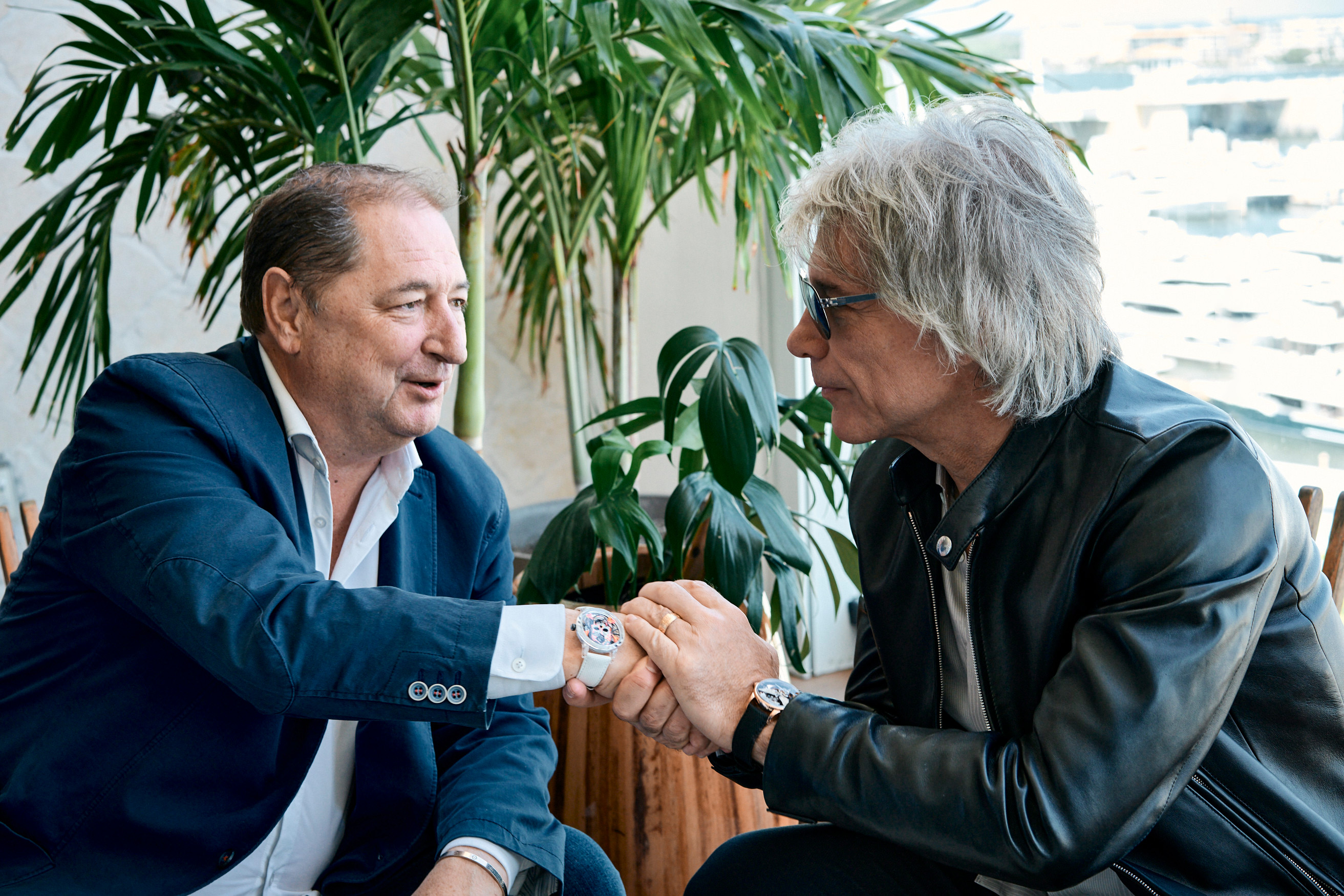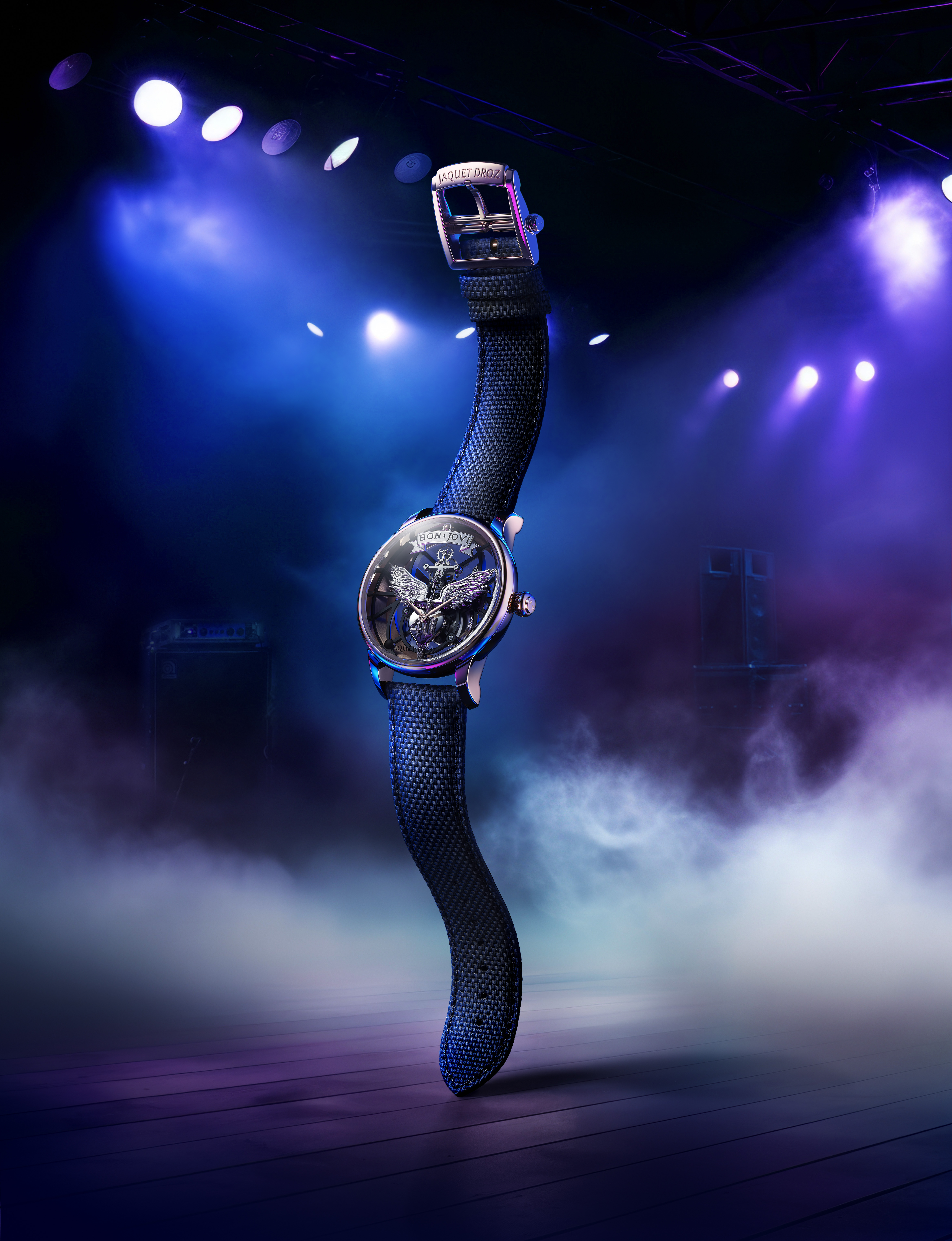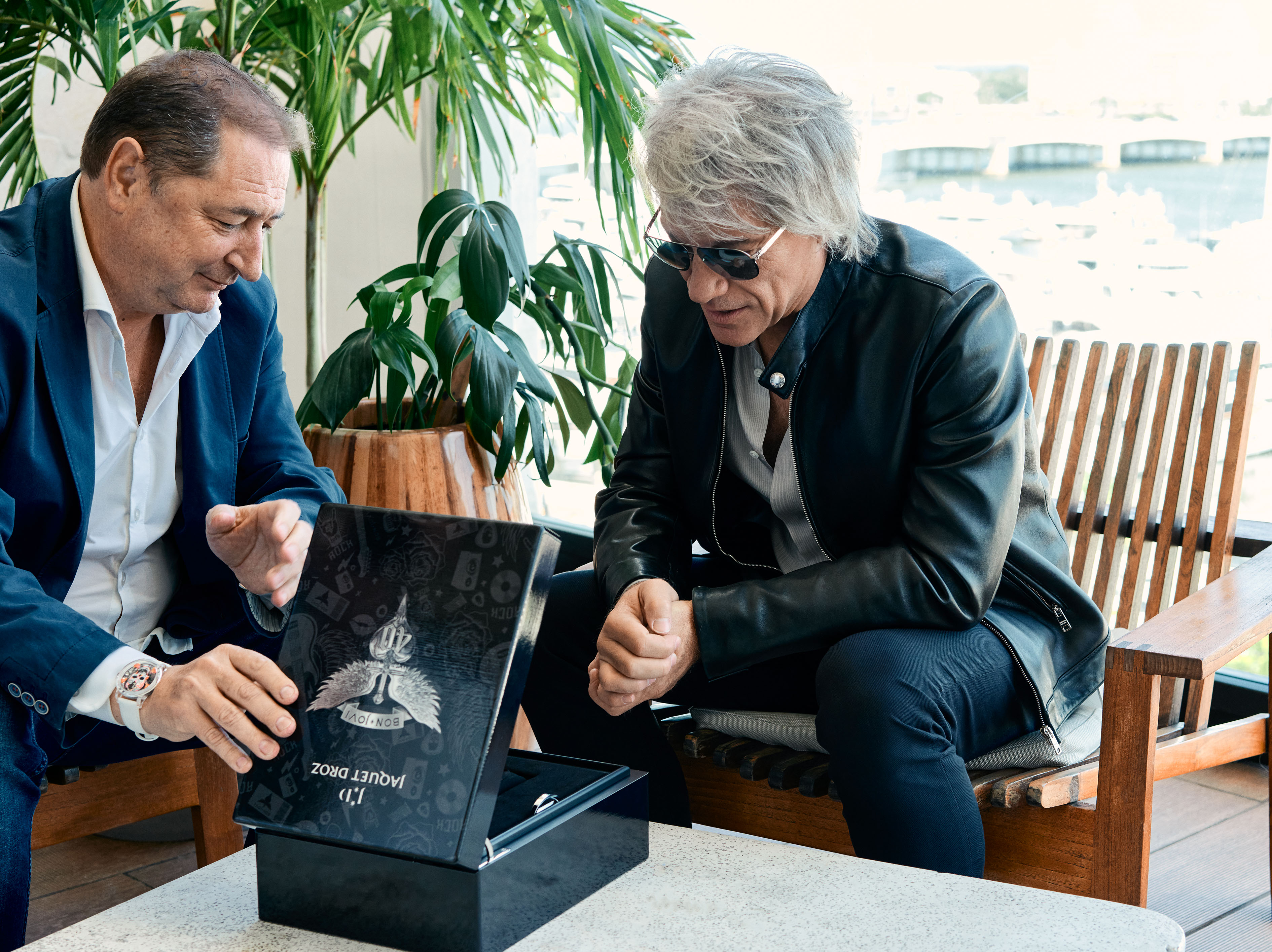 The Tourbillon Skelet Red Gold - Bon Jovi is a unique piece handcrafted to the artist's personal specifications. A self-winding skeleton tourbillon with an 8-day power reserve, it features the brand's new 40th anniversary logo, hand-engraved from a solid gold block.