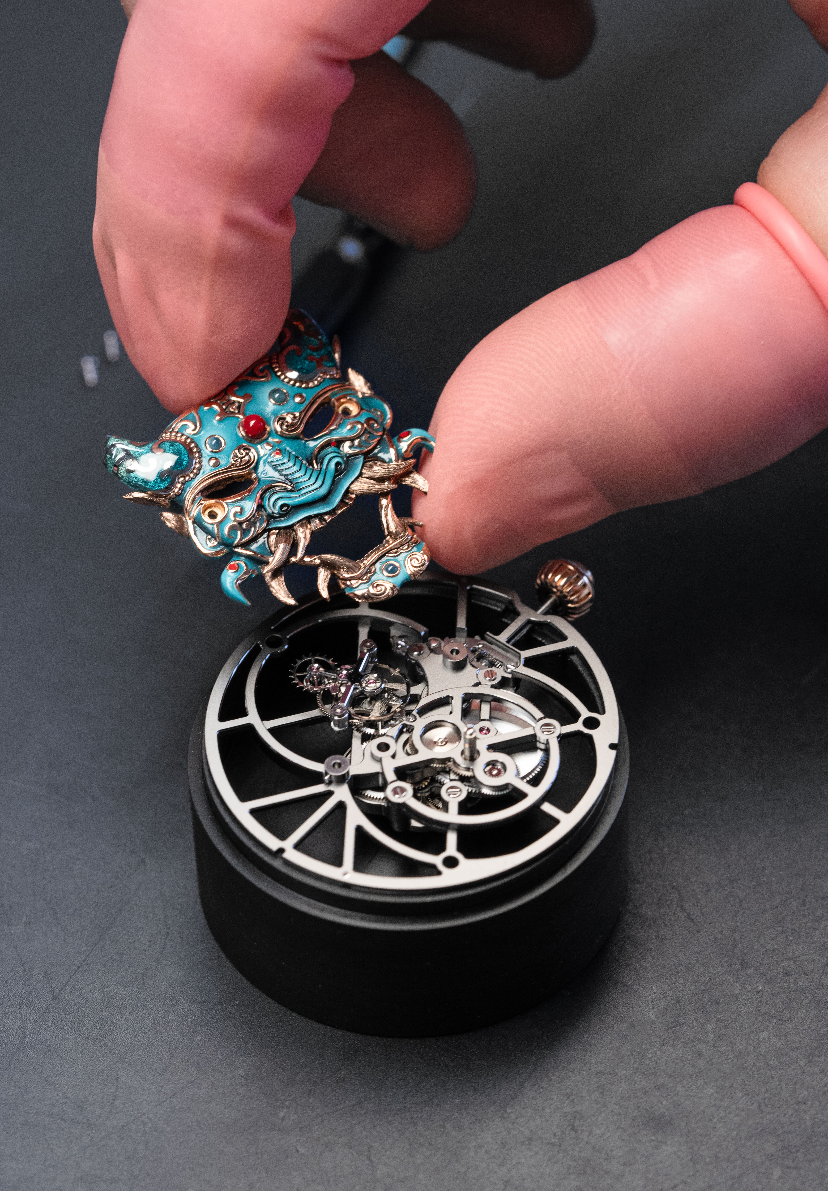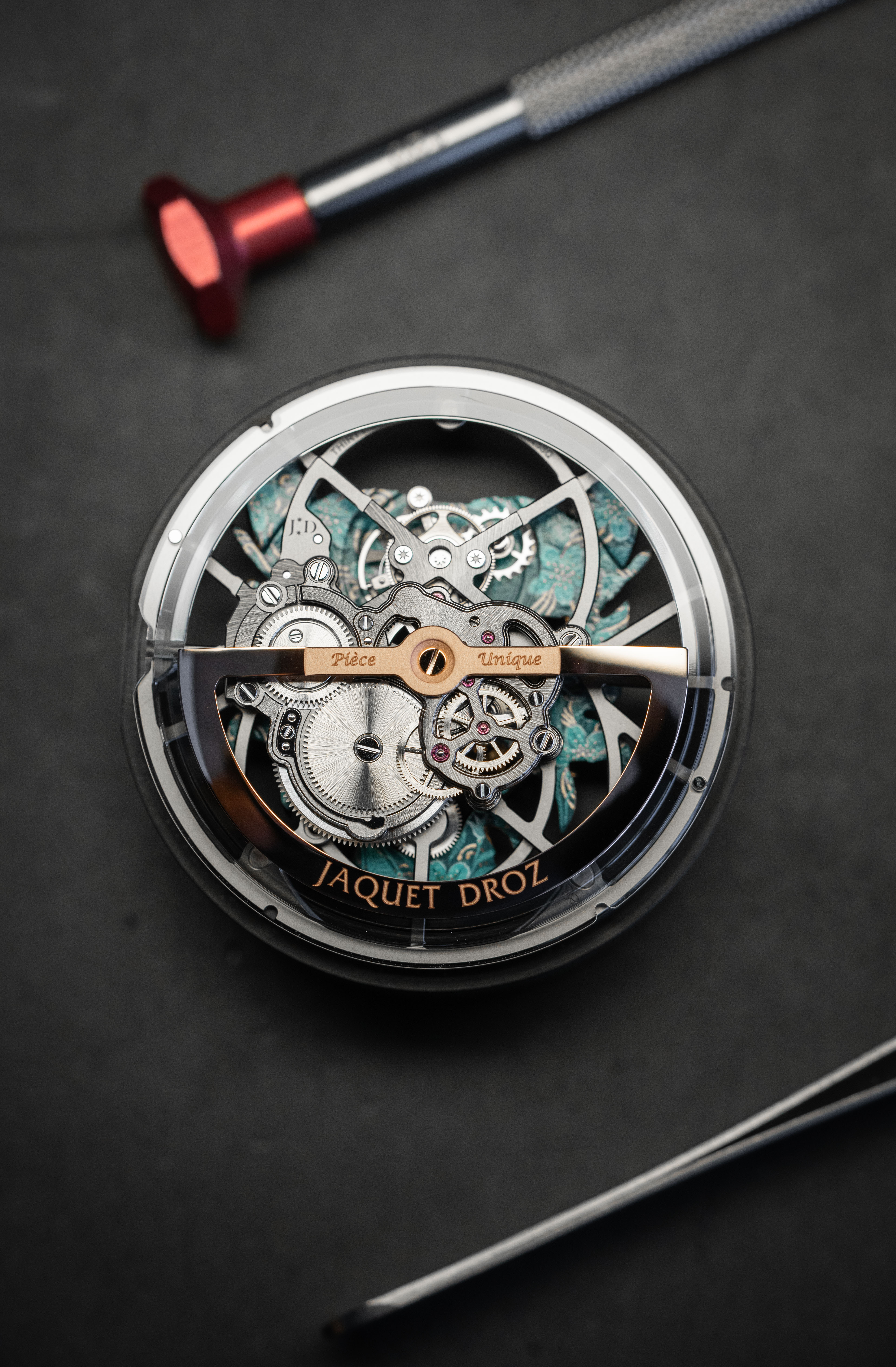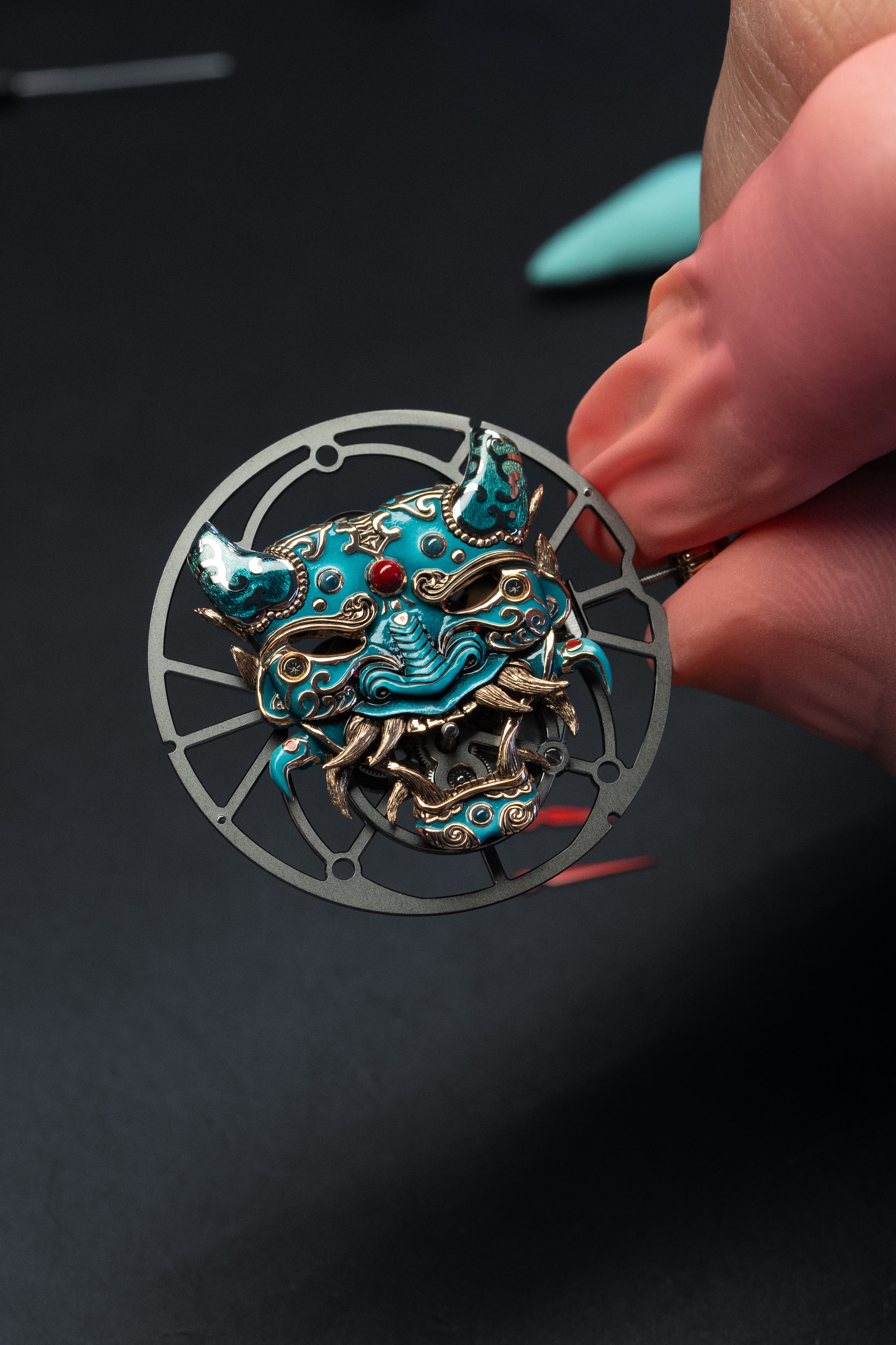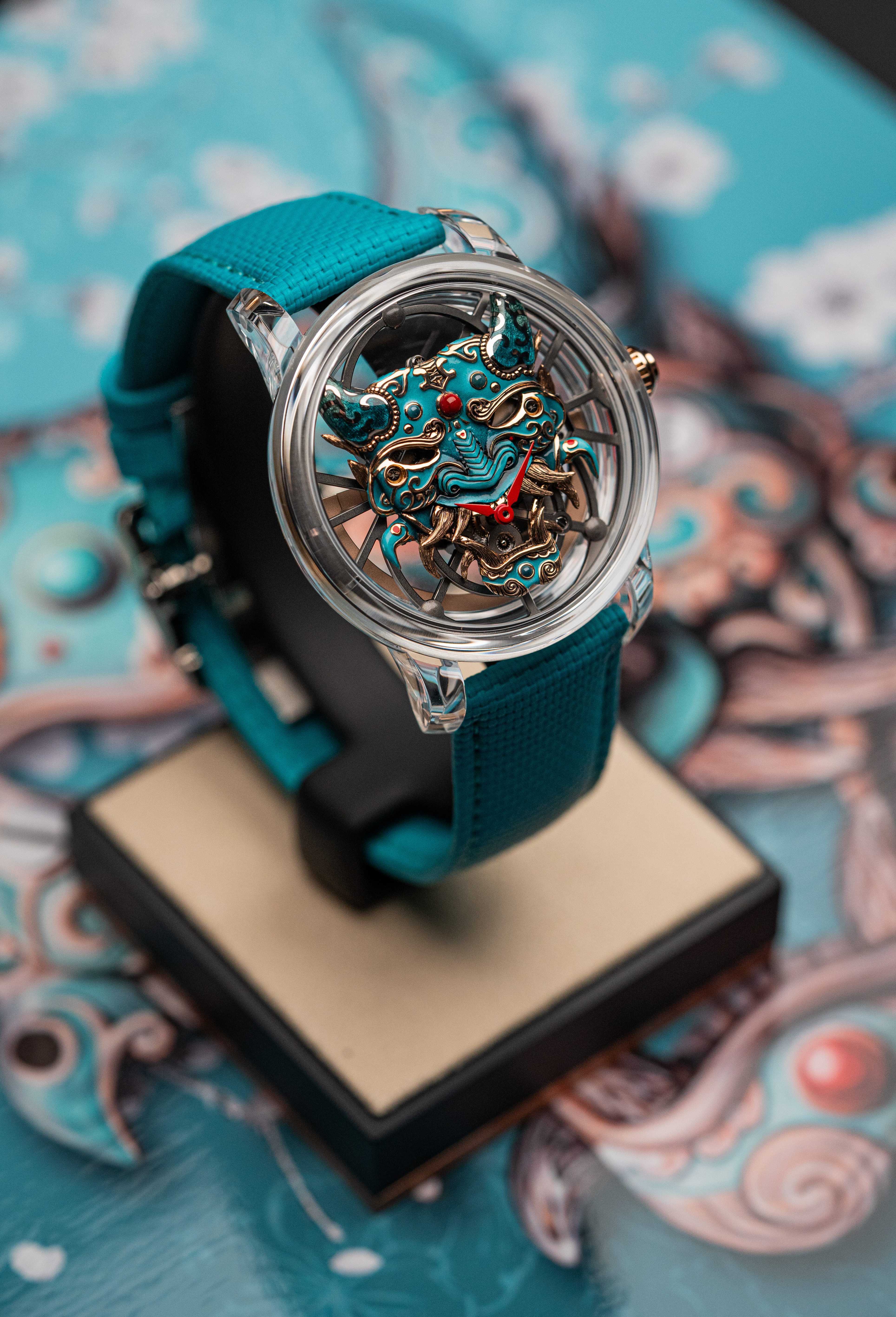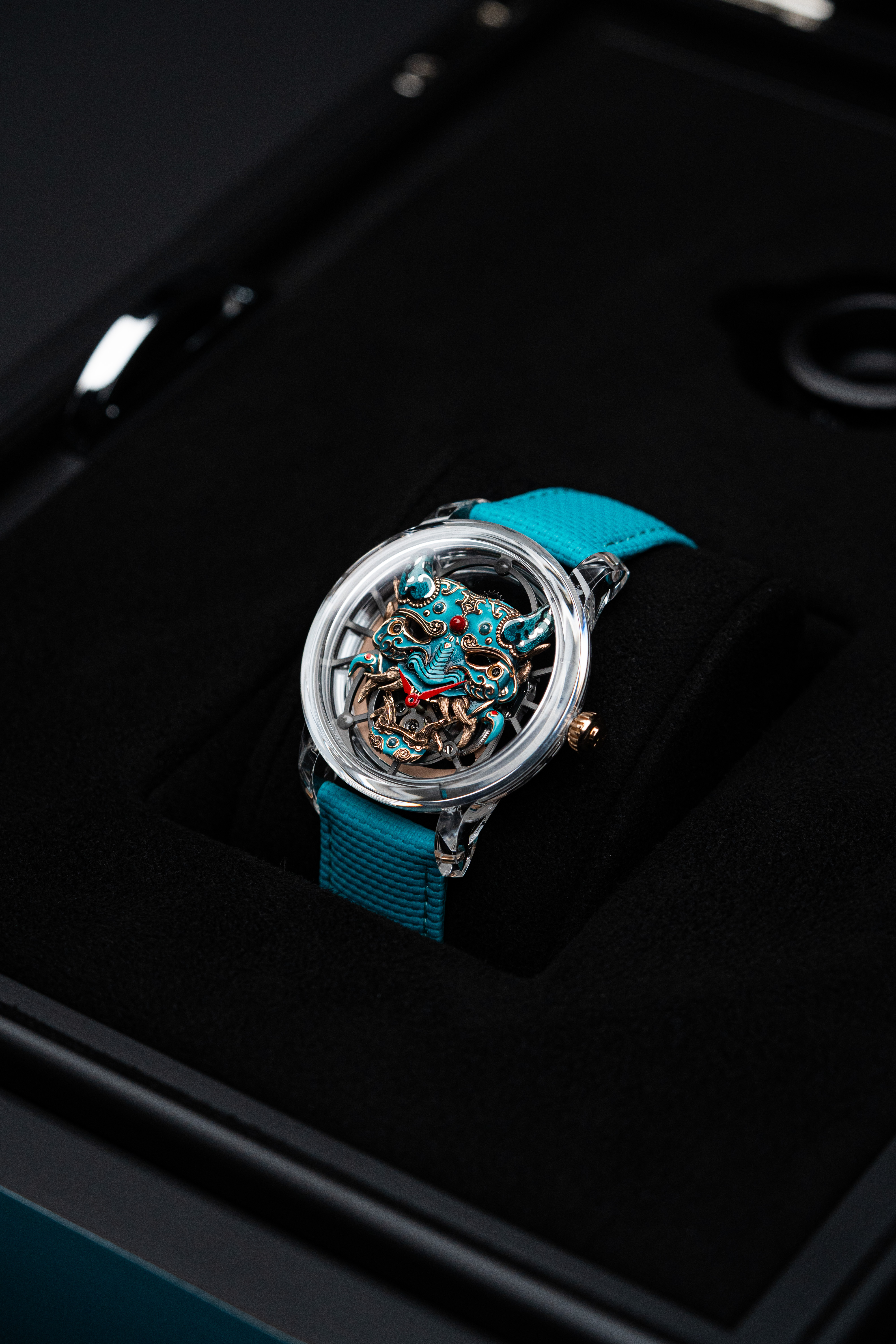 A unique tourbillon piece, the Tourbillon Skelet Sapphire – Bushidô embodies the power of the Japanese warrior's mask in a sapphire case. Expressive and superlative, combining 200 hours of manual craftsmanship and boasting an 8-day power reserve, it illustrates the Disruptive Legacy of Jaquet Droz with equal respect and freedom.