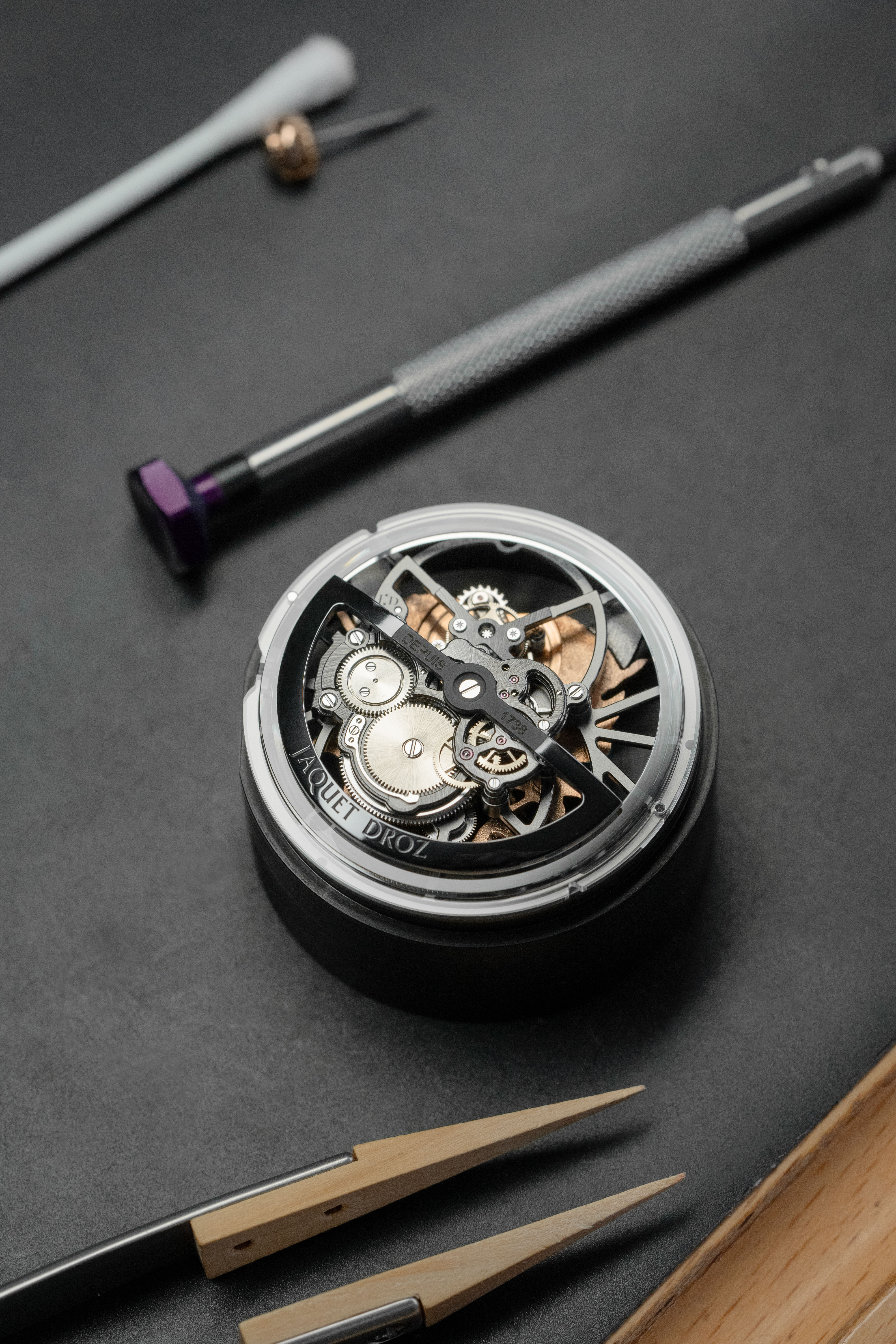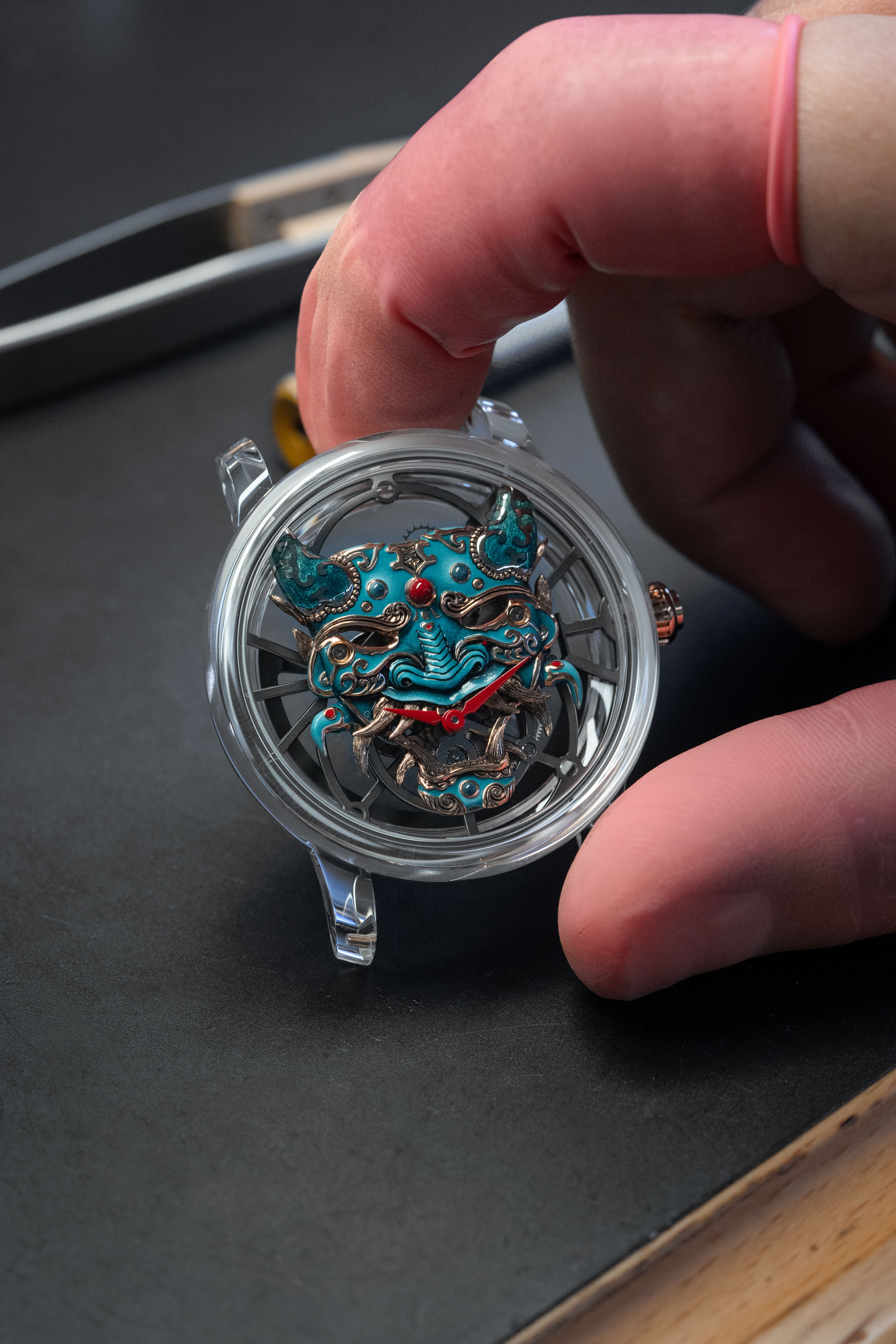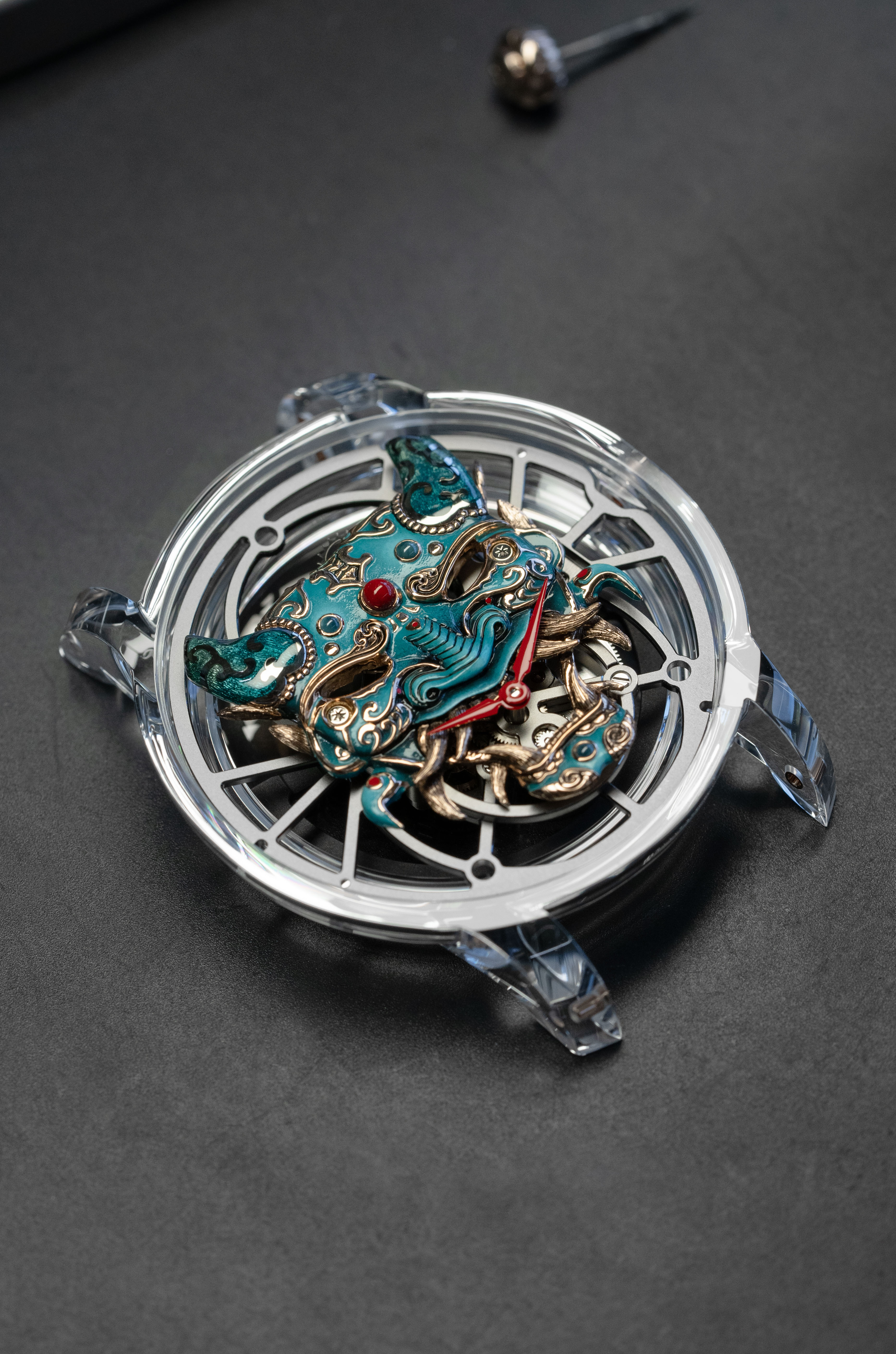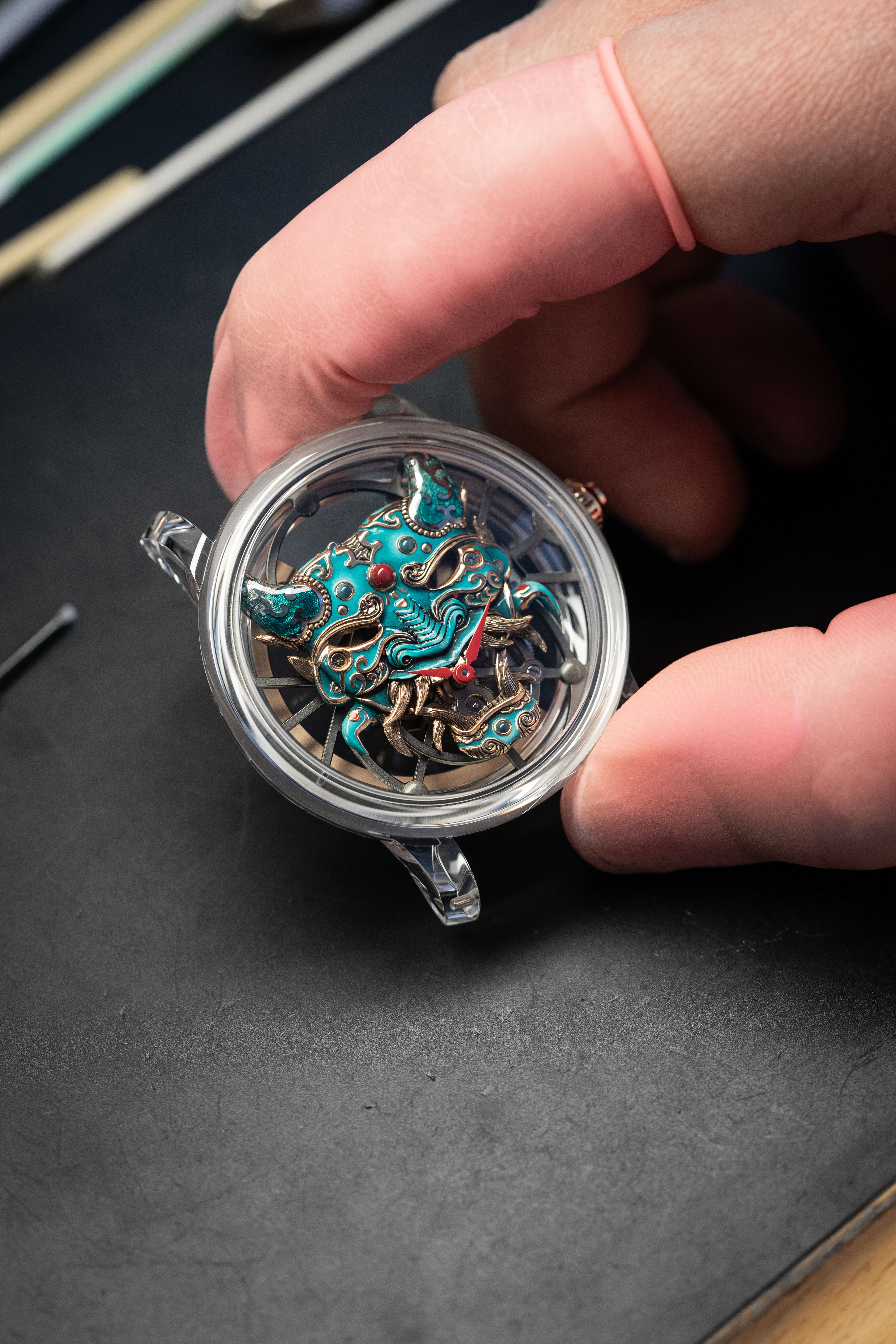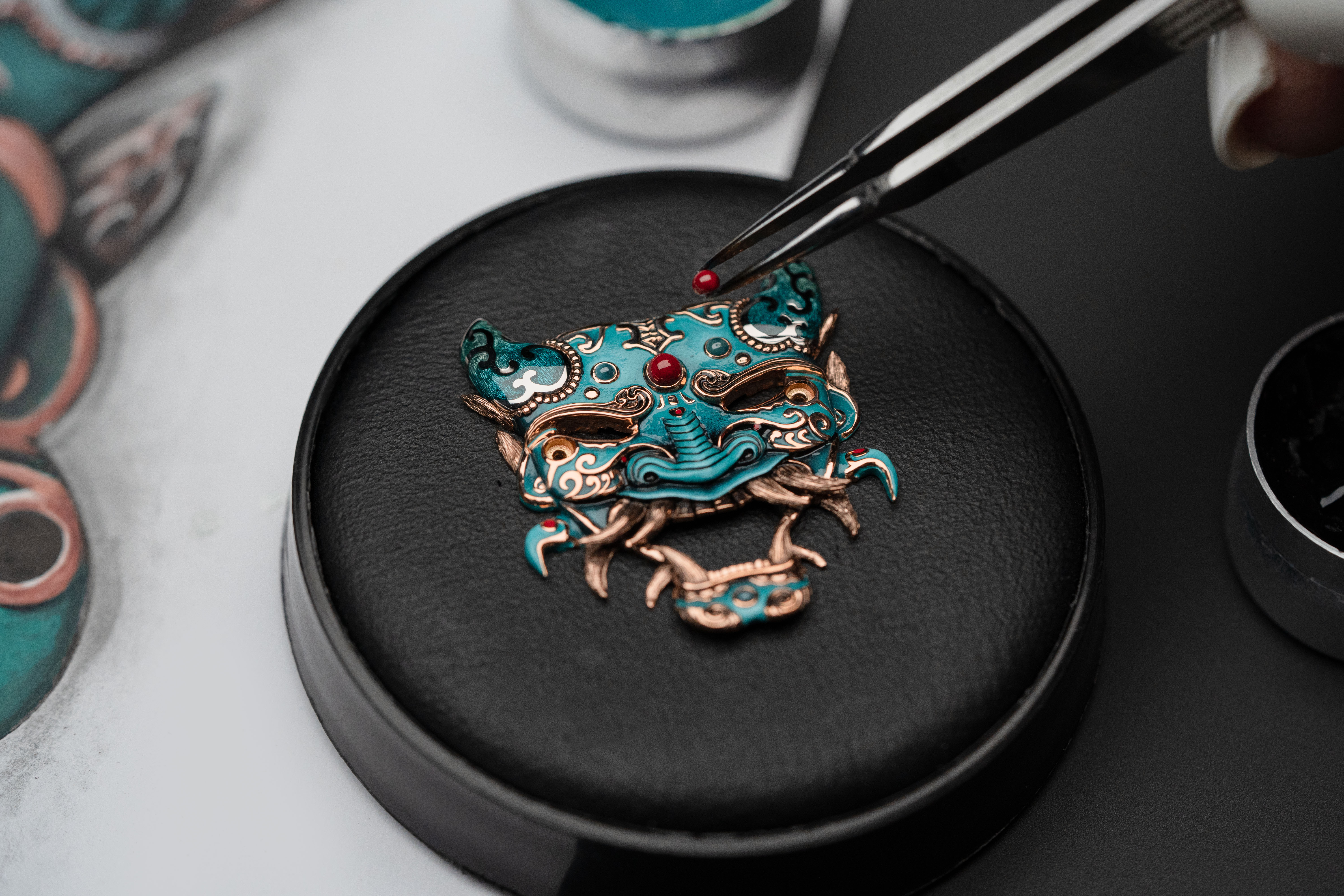 A unique tourbillon piece, the Tourbillon Skelet Sapphire – Bushidô embodies the power of the Japanese warrior's mask in a sapphire case. Expressive and superlative, combining 200 hours of manual craftsmanship and boasting an 8-day power reserve, it illustrates the Disruptive Legacy of Jaquet Droz with equal respect and freedom.